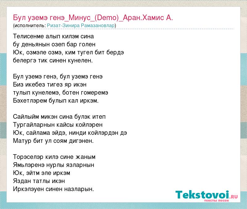 Телисенме алып килэм сина бу деньянын озеп бар голен Юк, озмэле озмэ, ким тугел бит бердэ белергэ тик синен кунелен. Бул уземэ генэ, бул уземэ генэ Биз икебез тигез яр икэн тулып кунелемэ, ботен гомеремэ Бэхетлэрем булып кал иркэм. Сайлыйм микэн сина булэк итеп Тургайларнын кайсы койлэрен Юк, сайлама эйдэ, нинди койлэрдэн дэ Матур бит ул соям дигэнен. Торэселэр килэ сине жаным Ямьлэренэ нурлы язларнын Юк, эйтм эле иркэм Яздан татлы икэн Иркэлэуен синен назларын.