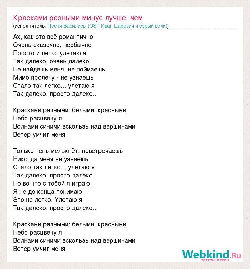 Главная→Исполнители→Песня Василисы (OST Иван Царевич и серый волк)→Красками разными минус лучше, чем