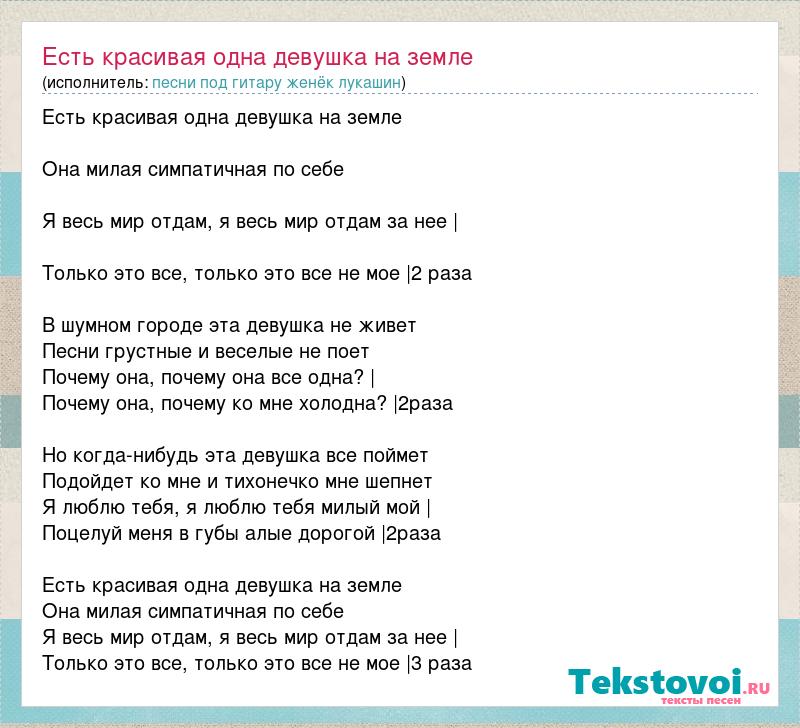 Есть красивая одна девушка на земле Она милая симпатичная по себе Я весь мир отдам, я весь мир отдам за нее | Только это все, только это все не мое |2 раза В шумном городе эта девушка не живет Песни грустные и веселые не поет Почему она, почему она все одна? | Почему она, почему ко мне холодна? |2раза Но когда-нибудь эта девушка все поймет Подойдет ко мне и тихонечко мне шепнет Я люблю тебя, я люблю тебя милый мой | Поцелуй меня в губы алые дорогой |2раза Есть красивая одна девушка на земле Она милая симпатичная по себе Я весь мир отдам, я весь мир отдам за нее | Только это все, только это все не мое |3 раза