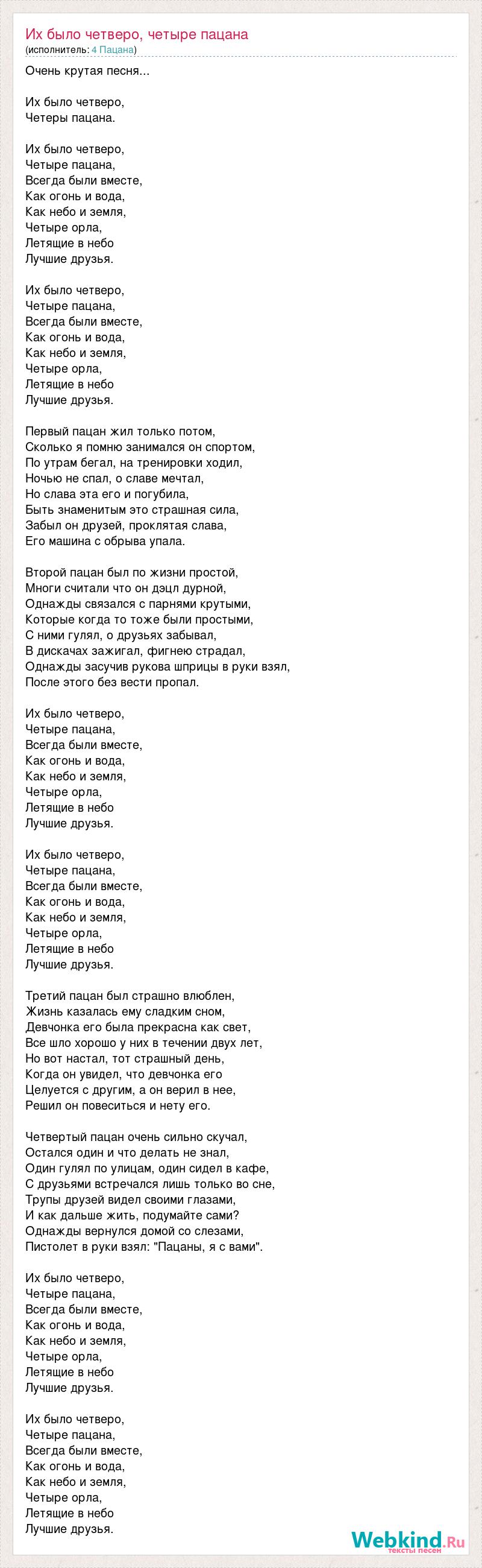 Очень крутая песня... Их было четверо, Четеры пацана. Их было четверо, Четыре пацана, Всегда были вместе, Как огонь и вода, Как небо и земля, Четыре орла, Летящие в небо Лучшие друзья. Их было четверо, Четыре пацана, Всегда были вместе, Как огонь и вода, Как небо и земля, Четыре орла, Летящие в небо Лучшие друзья. Первый пацан жил только потом, Сколько я помню занимался он спортом, По утрам бегал, на тренировки ходил, Ночью не спал, о славе мечтал, Но слава эта его и погубила, Быть знаменитым это страшная сила, Забыл он друзей, проклятая слава, Его машина с обрыва упала. Второй пацан был по жизни простой, Многи считали что он дэцл дурной, Однажды связался с парнями крутыми, Которые когда то тоже были простыми, С ними гулял, о друзьях забывал, В дискачах зажигал, фигнею страдал, Однажды засучив рукова шприцы в руки взял, После этого без вести пропал. Их было четверо, Четыре пацана, Всегда были вместе, Как огонь и вода, Как небо и земля, Четыре орла, Летящие в небо Лучшие друзья. Их было четверо, Четыре пацана, Всегда были вместе, Как огонь и вода, Как небо и земля, Четыре орла, Летящие в небо Лучшие друзья. Третий пацан был страшно влюблен, Жизнь казалась ему сладким сном, Девчонка его была прекрасна как свет, Все шло хорошо у них в течении двух лет, Но вот настал, тот страшный день, Когда он увидел, что девчонка его Целуется с другим, а он верил в нее, Решил он повеситься и нету его. Четвертый пацан очень сильно скучал, Остался один и что делать не знал, Один гулял по улицам, один сидел в кафе, С друзьями встречался лишь только во сне, Трупы друзей видел своими глазами, И как дальше жить, подумайте сами? Однажды вернулся домой со слезами, Пистолет в руки взял: "Пацаны, я с вами". Их было четверо, Четыре пацана, Всегда были вместе, Как огонь и вода, Как небо и земля, Четыре орла, Летящие в небо Лучшие друзья. Их было четверо, Четыре пацана, Всегда были вместе, Как огонь и вода, Как небо и земля, Четыре орла, Летящие в небо Лучшие друзья.