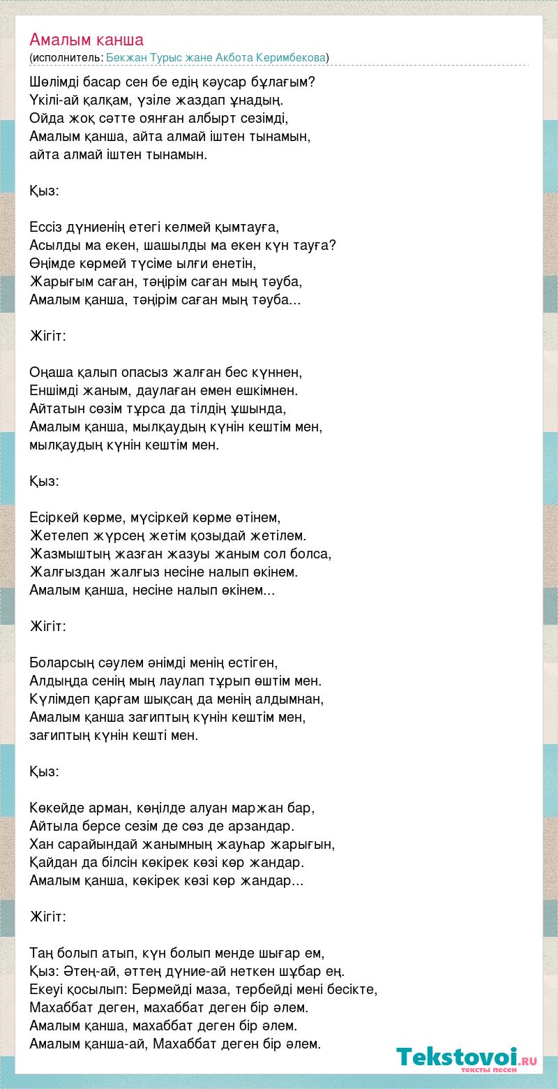 Шөлімді басар сен бе едің кәусар бұлағым? Үкілі-ай қалқам, үзіле жаздап ұнадың. Ойда жоқ сәтте оянған албырт сезімді, Амалым қанша, айта алмай іштен тынамын, айта алмай іштен тынамын. Қыз: Ессіз дүниенің етегі келмей қымтауға, Асылды ма екен, шашылды ма екен күн тауға? Өңімде көрмей түсіме ылғи енетін, Жарығым саған, тәңірім саған мың тәуба, Амалым қанша, тәңірім саған мың тәуба... Жігіт: Оңаша қалып опасыз жалған бес күннен, Еншімді жаным, даулаған емен ешкімнен. Айтатын сөзім тұрса да тілдің ұшында, Амалым қанша, мылқаудың күнін кештім мен, мылқаудың күнін кештім мен. Қыз: Есіркей көрме, мүсіркей көрме өтінем, Жетелеп жүрсең жетім қозыдай жетілем. Жазмыштың жазған жазуы жаным сол болса, Жалғыздан жалғыз несіне налып өкінем. Амалым қанша, несіне налып өкінем... Жігіт: Боларсың сәулем әнімді менің естіген, Алдыңда сенің мың лаулап тұрып өштім мен. Күлімдеп қарғам шықсаң да менің алдымнан, Амалым қанша зағиптың күнін кештім мен, зағиптың күнін кешті мен. Қыз: Көкейде арман, көңілде алуан маржан бар, Айтыла берсе сезім де сөз де арзандар. Хан сарайындай жанымның жауһар жарығын, Қайдан да білсін көкірек көзі көр жандар. Амалым қанша, көкірек көзі көр жандар... Жігіт: Таң болып атып, күн болып менде шығар ем, Қыз: Әтең-ай, әттең дүние-ай неткен шұбар ең. Екеуі қосылып: Бермейді маза, тербейді мені бесікте, Махаббат деген, махаббат деген бір әлем. Амалым қанша, махаббат деген бір әлем. Амалым қанша-ай, Махаббат деген бір әлем.
