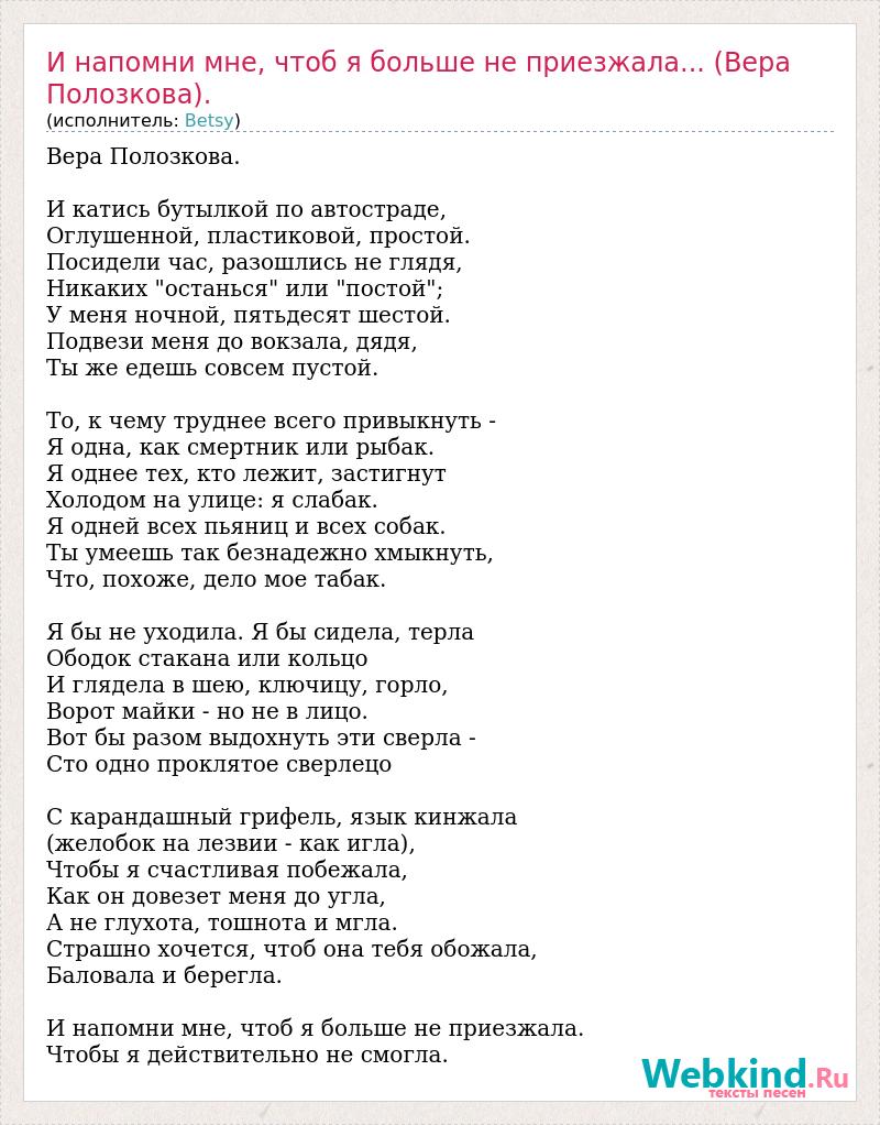 А как ты думаешь, о чем песня "И напомни мне, чтоб я больше не приезжала... (Вера Полозкова)." ?