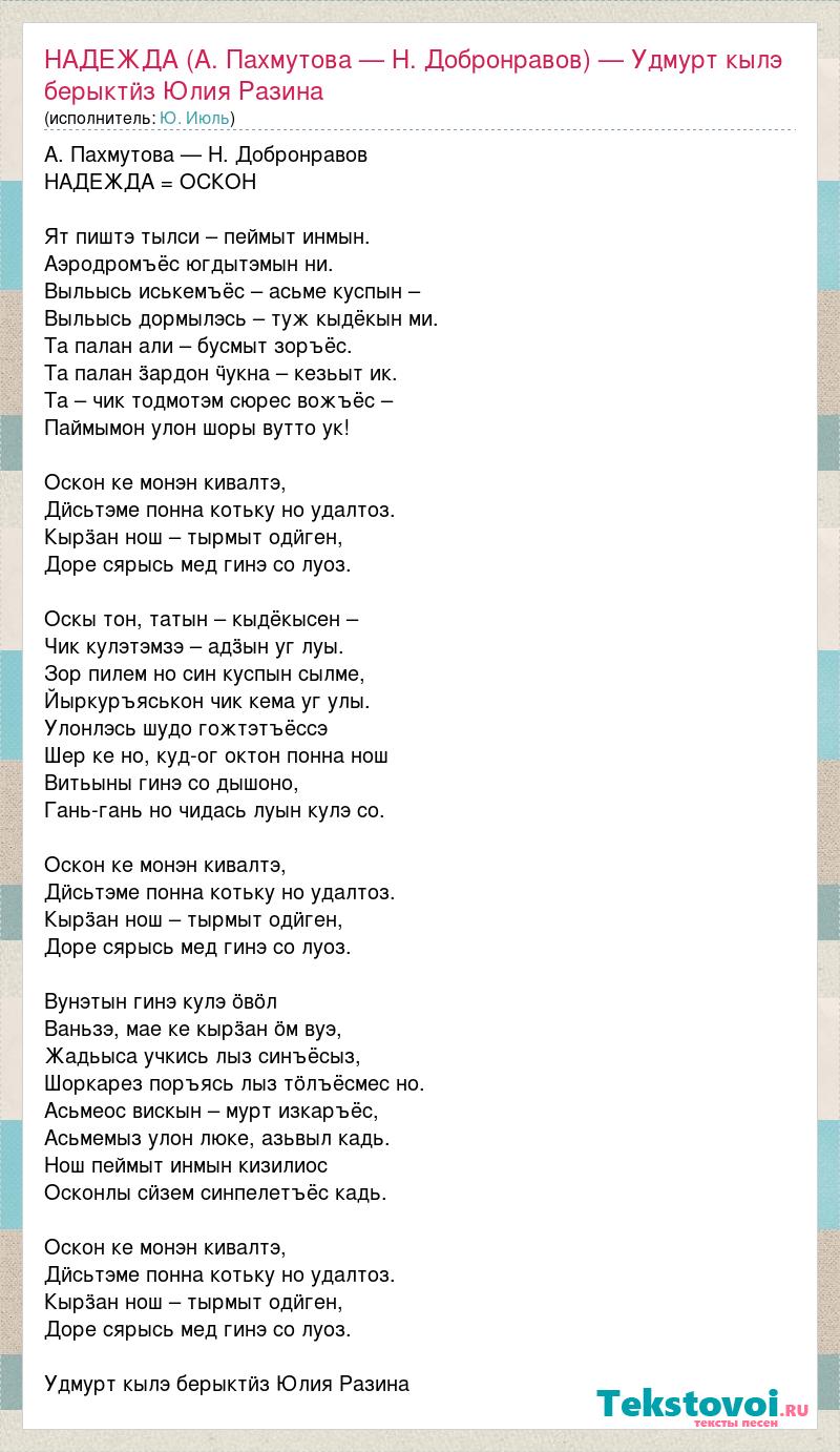 А. Пахмутова — Н. Добронравов НАДЕЖДА = ОСКОН Ят пиштэ тылси – пеймыт инмын. Аэродромъёс югдытэмын ни. Выльысь иськемъёс – асьме куспын – Выльысь дормылэсь – туж кыдёкын ми. Та палан али – бусмыт зоръёс. Та палан ӟардон ӵукна – кезьыт ик. Та – чик тодмотэм сюрес вожъёс – Паймымон улон шоры вутто ук! Оскон ке монэн кивалтэ, Дӥсьтэме понна котьку но удалтоз. Кырӟан нош – тырмыт одӥген, Доре сярысь мед гинэ со луоз. Оскы тон, татын – кыдёкысен – Чик кулэтэмзэ – адӟын уг луы. Зор пилем но син куспын сылме, Йыркуръяськон чик кема уг улы. Улонлэсь шудо гожтэтъёссэ Шер ке но, куд-ог октон понна нош Витьыны гинэ со дышоно, Гань-гань но чидась луын кулэ со. Оскон ке монэн кивалтэ, Дӥсьтэме понна котьку но удалтоз. Кырӟан нош – тырмыт одӥген, Доре сярысь мед гинэ со луоз. Вунэтын гинэ кулэ ӧвӧл Ваньзэ, мае ке кырӟан ӧм вуэ, Жадьыса учкись лыз синъёсыз, Шоркарез поръясь лыз тӧлъёсмес но. Асьмеос вискын – мурт изкаръёс, Асьмемыз улон люке, азьвыл кадь. Нош пеймыт инмын кизилиос Осконлы сӥзем синпелетъёс кадь. Оскон ке монэн кивалтэ, Дӥсьтэме понна котьку но удалтоз. Кырӟан нош – тырмыт одӥген, Доре сярысь мед гинэ со луоз. Удмурт кылэ берыктӥз Юлия Разина