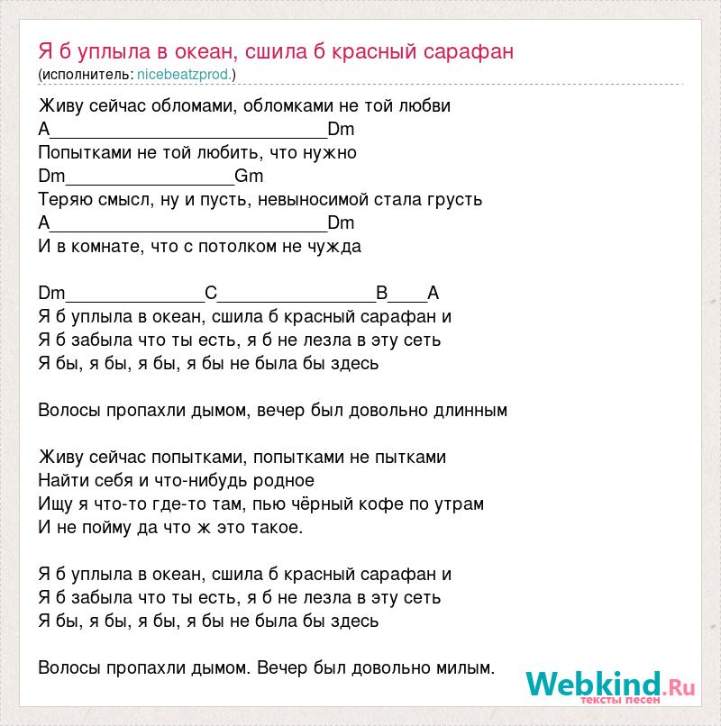 Живу сейчас обломами, обломками не той любви A____________________________Dm Попытками не той любить, что нужно Dm_________________Gm Теряю смысл, ну и пусть, невыносимой стала грусть A____________________________Dm И в комнате, что с потолком не чужда Dm______________C________________B____A Я б уплыла в океан, сшила б красный сарафан и Я б забыла что ты есть, я б не лезла в эту сеть Я бы, я бы, я бы, я бы не была бы здесь Волосы пропахли дымом, вечер был довольно длинным Живу сейчас попытками, попытками не пытками Найти себя и что-нибудь родное Ищу я что-то где-то там, пью чёрный кофе по утрам И не пойму да что ж это такое. Я б уплыла в океан, сшила б красный сарафан и Я б забыла что ты есть, я б не лезла в эту сеть Я бы, я бы, я бы, я бы не была бы здесь Волосы пропахли дымом. Вечер был довольно милым.