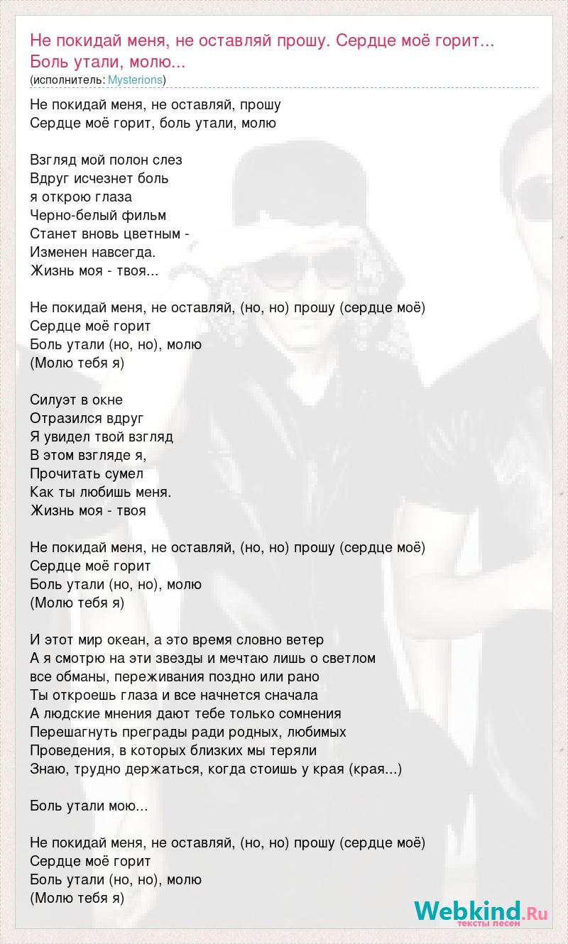 Не покидай меня, не оставляй, прошу Сердце моё горит, боль утали, молю Взгляд мой полон слез Вдруг исчезнет боль я открою глаза Черно-белый фильм Станет вновь цветным - Изменен навсегда. Жизнь моя - твоя... Не покидай меня, не оставляй, (но, но) прошу (сердце моё) Сердце моё горит Боль утали (но, но), молю (Молю тебя я) Силуэт в окне Отразился вдруг Я увидел твой взгляд В этом взгляде я, Прочитать сумел Как ты любишь меня. Жизнь моя - твоя Не покидай меня, не оставляй, (но, но) прошу (сердце моё) Сердце моё горит Боль утали (но, но), молю (Молю тебя я) И этот мир океан, а это время словно ветер А я смотрю на эти звезды и мечтаю лишь о светлом все обманы, переживания поздно или рано Ты откроешь глаза и все начнется сначала А людские мнения дают тебе только сомнения Перешагнуть преграды ради родных, любимых Проведения, в которых близких мы теряли Знаю, трудно держаться, когда стоишь у края (края...) Боль утали мою... Не покидай меня, не оставляй, (но, но) прошу (сердце моё) Сердце моё горит Боль утали (но, но), молю (Молю тебя я)