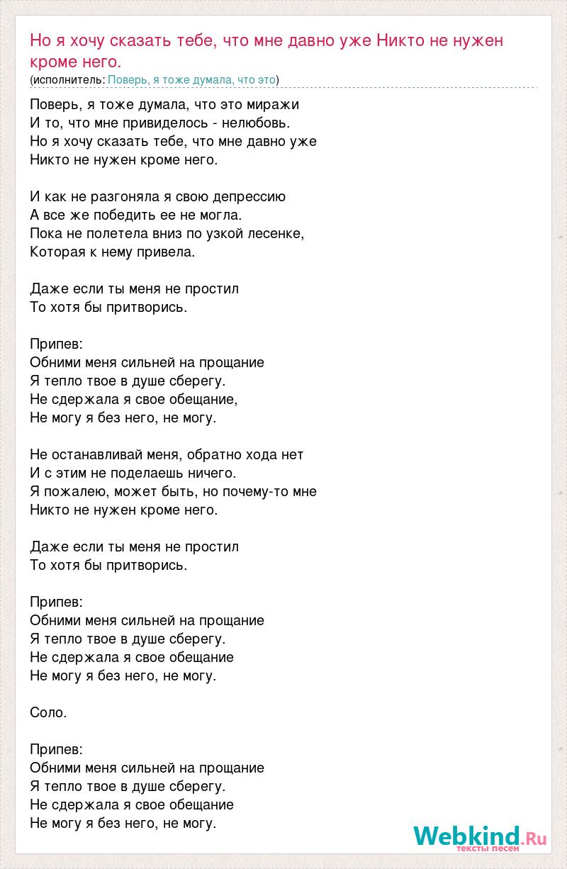 Поверь, я тоже думала, что это миражи И то, что мне привиделось - нелюбовь. Но я хочу сказать тебе, что мне давно уже Никто не нужен кроме него. И как не разгоняла я свою депрессию А все же победить ее не могла. Пока не полетела вниз по узкой лесенке, Которая к нему привела. Даже если ты меня не простил То хотя бы притворись. Припев: Обними меня сильней на прощание Я тепло твое в душе сберегу. Не сдержала я свое обещание, Не могу я без него, не могу. Не останавливай меня, обратно хода нет И с этим не поделаешь ничего. Я пожалею, может быть, но почему-то мне Никто не нужен кроме него. Даже если ты меня не простил То хотя бы притворись. Припев: Обними меня сильней на прощание Я тепло твое в душе сберегу. Не сдержала я свое обещание Не могу я без него, не могу. Соло. Припев: Обними меня сильней на прощание Я тепло твое в душе сберегу. Не сдержала я свое обещание Не могу я без него, не могу.