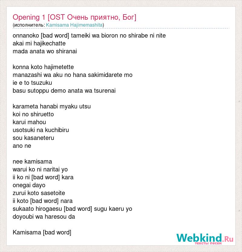 onnanoko [bad word] tameiki wa bioron no shirabe ni nite akai mi hajikechatte mada anata wo shiranai konna koto hajimetette manazashi wa aku no hana sakimidarete mo ie e to tsuzuku basu sutoppu demo anata wa tsurenai karameta hanabi myaku utsu koi no shiruetto karui mahou usotsuki na kuchibiru sou kasaneteru ano ne nee kamisama warui ko ni naritai yo ii ko ni [bad word] kara onegai dayo zurui koto sasetoite ii koto [bad word] nara sukaato hirogaesu [bad word] sugu kaeru yo doyoubi wa haresou da Kamisama [bad word]