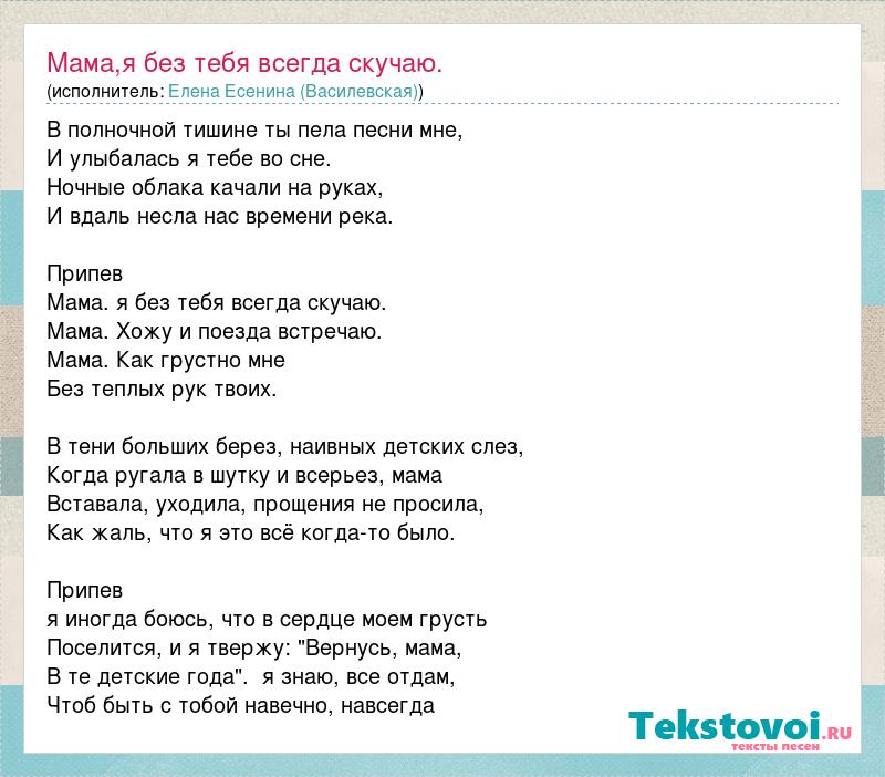 В полночной тишине ты пела песни мне, И улыбалась я тебе во сне. Ночные облака качали на руках, И вдаль несла нас времени река. Припев Мама. я без тебя всегда скучаю. Мама. Хожу и поезда встречаю. Мама. Как грустно мне Без теплых рук твоих. В тени больших берез, наивных детских слез, Когда ругала в шутку и всерьез, мама Вставала, уходила, прощения не просила, Как жаль, что я это всё когда-то было. Припев я иногда боюсь, что в сердце моем грусть Поселится, и я твержу: "Вернусь, мама, В те детские года". я знаю, все отдам, Чтоб быть с тобой навечно, навсегда