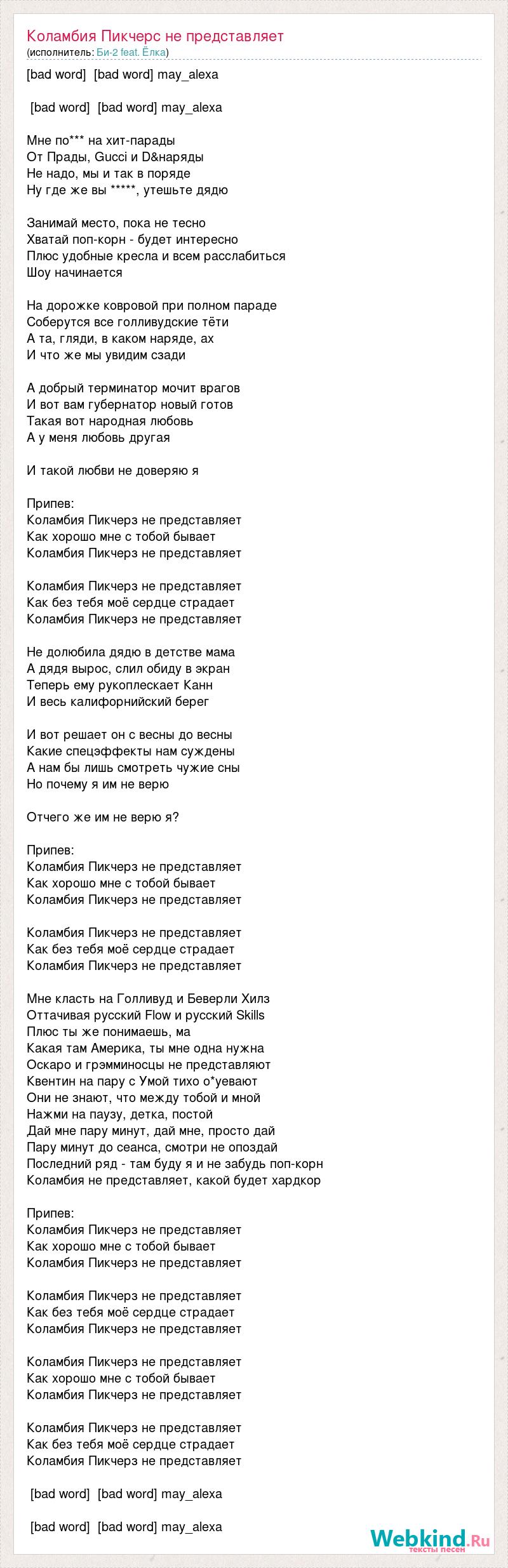 [bad word] [bad word] may_alexa [bad word] [bad word] may_alexa Мне по*** на хит-парады От Прады, Gucci и D&наряды Не надо, мы и так в поряде Ну где же вы *****, утешьте дядю Занимай место, пока не тесно Хватай поп-корн - будет интересно Плюс удобные кресла и всем расслабиться Шоу начинается На дорожке ковровой при полном параде Соберутся все голливудские тёти А та, гляди, в каком наряде, ах И что же мы увидим сзади А добрый терминатор мочит врагов И вот вам губернатор новый готов Такая вот народная любовь А у меня любовь другая И такой любви не доверяю я Припев: Коламбия Пикчерз не представляет Как хорошо мне с тобой бывает Коламбия Пикчерз не представляет Коламбия Пикчерз не представляет Как без тебя моё сердце страдает Коламбия Пикчерз не представляет Не долюбила дядю в детстве мама А дядя вырос, слил обиду в экран Теперь ему рукоплескает Канн И весь калифорнийский берег И вот решает он с весны до весны Какие спецэффекты нам суждены А нам бы лишь смотреть чужие сны Но почему я им не верю Отчего же им не верю я? Припев: Коламбия Пикчерз не представляет Как хорошо мне с тобой бывает Коламбия Пикчерз не представляет Коламбия Пикчерз не представляет Как без тебя моё сердце страдает Коламбия Пикчерз не представляет Мне класть на Голливуд и Беверли Хилз Оттачивая русский Flow и русский Skills Плюс ты же понимаешь, ма Какая там Америка, ты мне одна нужна Оскаро и грэмминосцы не представляют Квентин на пару с Умой тихо о*уевают Они не знают, что между тобой и мной Нажми на паузу, детка, постой Дай мне пару минут, дай мне, просто дай Пару минут до сеанса, смотри не опоздай Последний ряд - там буду я и не забудь поп-корн Коламбия не представляет, какой будет хардкор Припев: Коламбия Пикчерз не представляет Как хорошо мне с тобой бывает Коламбия Пикчерз не представляет Коламбия Пикчерз не представляет Как без тебя моё сердце страдает Коламбия Пикчерз не представляет Коламбия Пикчерз не представляет Как хорошо мне с тобой бывает Коламбия Пикчерз не представляет Коламбия Пикчерз не представляет Как без тебя моё сердце страдает Коламбия Пикчерз не представляет [bad word] [bad word] may_alexa [bad word] [bad word] may_alexa