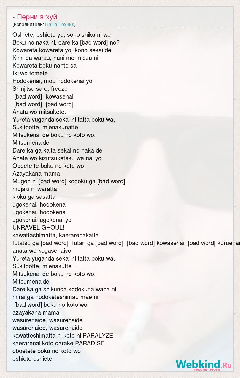 Oshiete, oshiete yo, sono shikumi wo Boku no naka ni, dare ka [bad word] no? Kowareta kowareta yo, kono sekai de Kimi ga warau, nani mo miezu ni Kowareta boku nante sa Iki wo tomete Hodokenai, mou hodokenai yo Shinjitsu sa e, freeze [bad word] kowasenai [bad word] [bad word] Anata wo mitsukete. Yureta yuganda sekai ni tatta boku wa, Sukitootte, mienakunatte Mitsukenai de boku no koto wo, Mitsumenaide Dare ka ga kaita sekai no naka de Anata wo kizutsuketaku wa nai yo Oboete te boku no koto wo Azayakana mama Mugen ni [bad word] kodoku ga [bad word] mujaki ni waratta kioku ga sasatta ugokenai, hodokenai ugokenai, hodokenai ugokenai, ugokenai yo UNRAVEL GHOUL! kawattashimatta, kaerarenakatta futatsu ga [bad word] futari ga [bad word] [bad word] kowasenai, [bad word] kuruenai anata wo kegasenaiyo Yureta yuganda sekai ni tatta boku wa, Sukitootte, mienakutte Mitsukenai de boku no koto wo, Mitsumenaide Dare ka ga shikunda kodokuna wana ni mirai ga hodoketeshimau mae ni [bad word] boku no koto wo azayakana mama wasurenaide, wasurenaide wasurenaide, wasurenaide kawatteshimatta ni koto ni PARALYZE kaerarenai koto darake PARADISE oboetete boku no koto wo oshiete oshiete
