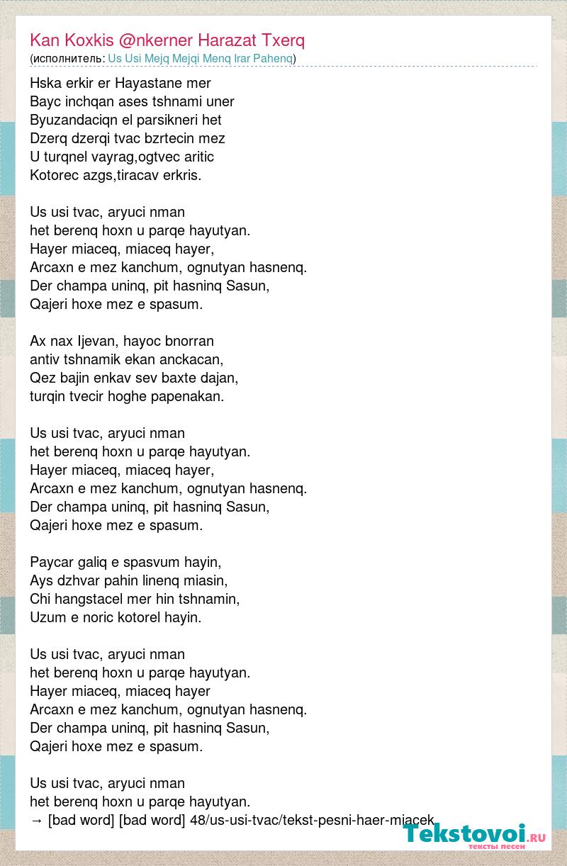 Hska erkir er Hayastane mer Bayc inchqan ases tshnami uner Byuzandaciqn el parsikneri het Dzerq dzerqi tvac bzrtecin mez U turqnel vayrag,ogtvec aritic Kotorec azgs,tiracav erkris. Us usi tvac, aryuci nman het berenq hoxn u parqe hayutyan. Hayer miaceq, miaceq hayer, Arcaxn e mez kanchum, ognutyan hasnenq. Der champa uninq, pit hasninq Sasun, Qajeri hoxe mez e spasum. Ax nax Ijevan, hayoc bnorran antiv tshnamik ekan anckacan, Qez bajin enkav sev baxte dajan, turqin tvecir hoghe papenakan. Us usi tvac, aryuci nman het berenq hoxn u parqe hayutyan. Hayer miaceq, miaceq hayer, Arcaxn e mez kanchum, ognutyan hasnenq. Der champa uninq, pit hasninq Sasun, Qajeri hoxe mez e spasum. Paycar galiq e spasvum hayin, Ays dzhvar pahin linenq miasin, Chi hangstacel mer hin tshnamin, Uzum e noric kotorel hayin. Us usi tvac, aryuci nman het berenq hoxn u parqe hayutyan. Hayer miaceq, miaceq hayer Arcaxn e mez kanchum, ognutyan hasnenq. Der champa uninq, pit hasninq Sasun, Qajeri hoxe mez e spasum. Us usi tvac, aryuci nman het berenq hoxn u parqe hayutyan. → [bad word] [bad word] 48/us-usi-tvac/tekst-pesni-haer-miacek
