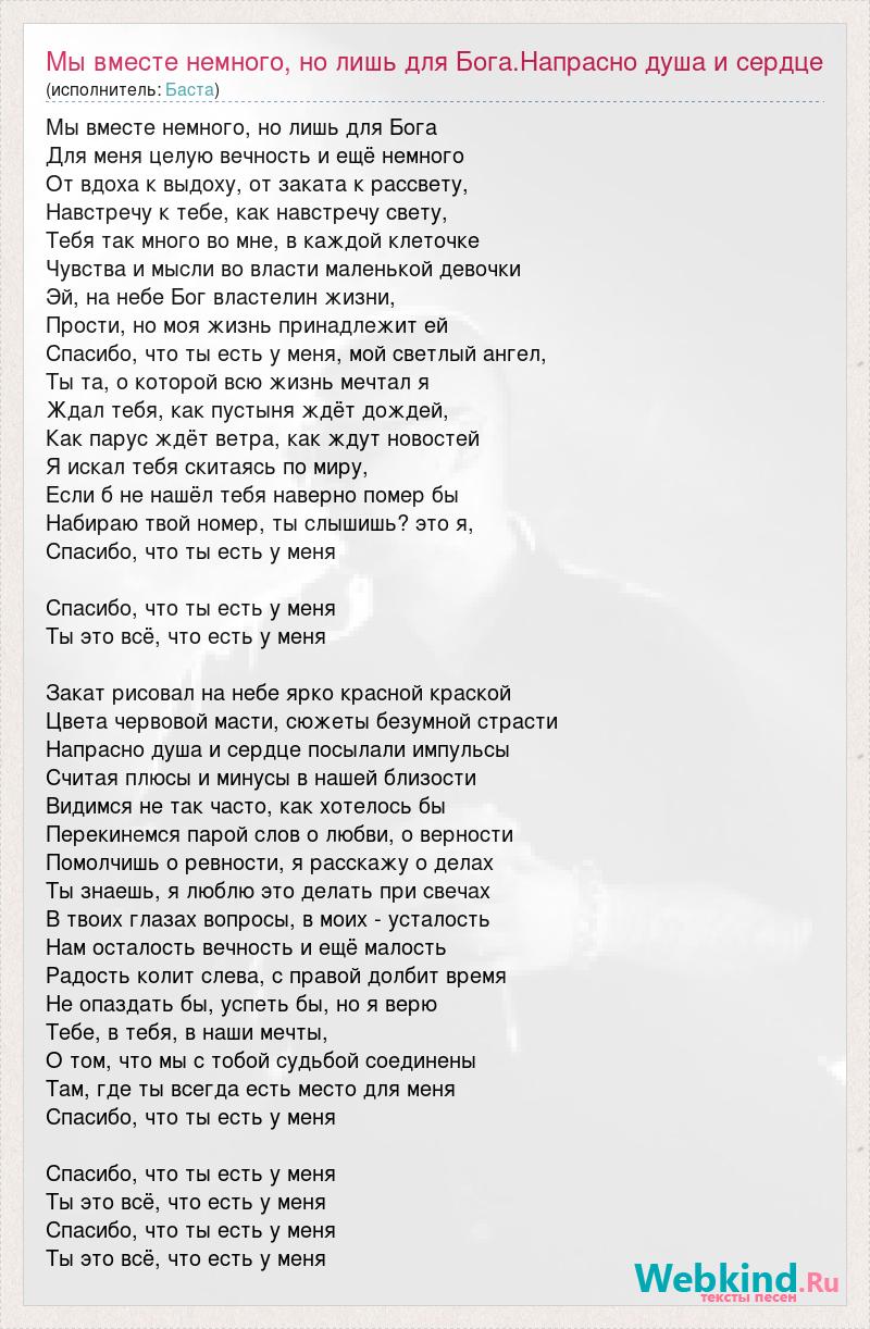 Мы вместе немного, но лишь для Бога Для меня целую вечность и ещё немного От вдоха к выдоху, от заката к рассвету, Навстречу к тебе, как навстречу свету, Тебя так много во мне, в каждой клеточке Чувства и мысли во власти маленькой девочки Эй, на небе Бог властелин жизни, Прости, но моя жизнь принадлежит ей Спасибо, что ты есть у меня, мой светлый ангел, Ты та, о которой всю жизнь мечтал я Ждал тебя, как пустыня ждёт дождей, Как парус ждёт ветра, как ждут новостей Я искал тебя скитаясь по миру, Если б не нашёл тебя наверно помер бы Набираю твой номер, ты слышишь? это я, Спасибо, что ты есть у меня Спасибо, что ты есть у меня Ты это всё, что есть у меня Закат рисовал на небе ярко красной краской Цвета червовой масти, сюжеты безумной страсти Напрасно душа и сердце посылали импульсы Считая плюсы и минусы в нашей близости Видимся не так часто, как хотелось бы Перекинемся парой слов о любви, о верности Помолчишь о ревности, я расскажу о делах Ты знаешь, я люблю это делать при свечах В твоих глазах вопросы, в моих - усталость Нам осталость вечность и ещё малость Радость колит слева, с правой долбит время Не опаздать бы, успеть бы, но я верю Тебе, в тебя, в наши мечты, О том, что мы с тобой судьбой соединены Там, где ты всегда есть место для меня Спасибо, что ты есть у меня Спасибо, что ты есть у меня Ты это всё, что есть у меня Спасибо, что ты есть у меня Ты это всё, что есть у меня