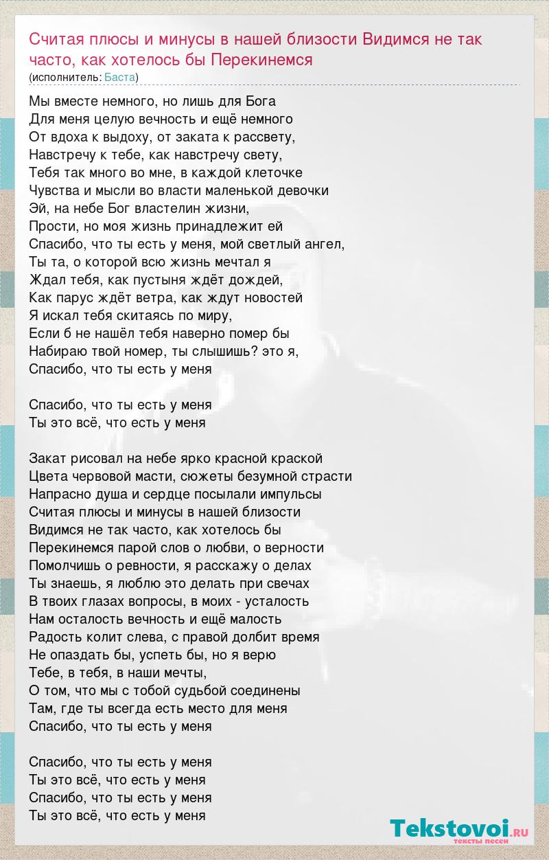 Мы вместе немного, но лишь для Бога Для меня целую вечность и ещё немного От вдоха к выдоху, от заката к рассвету, Навстречу к тебе, как навстречу свету, Тебя так много во мне, в каждой клеточке Чувства и мысли во власти маленькой девочки Эй, на небе Бог властелин жизни, Прости, но моя жизнь принадлежит ей Спасибо, что ты есть у меня, мой светлый ангел, Ты та, о которой всю жизнь мечтал я Ждал тебя, как пустыня ждёт дождей, Как парус ждёт ветра, как ждут новостей Я искал тебя скитаясь по миру, Если б не нашёл тебя наверно помер бы Набираю твой номер, ты слышишь? это я, Спасибо, что ты есть у меня Спасибо, что ты есть у меня Ты это всё, что есть у меня Закат рисовал на небе ярко красной краской Цвета червовой масти, сюжеты безумной страсти Напрасно душа и сердце посылали импульсы Считая плюсы и минусы в нашей близости Видимся не так часто, как хотелось бы Перекинемся парой слов о любви, о верности Помолчишь о ревности, я расскажу о делах Ты знаешь, я люблю это делать при свечах В твоих глазах вопросы, в моих - усталость Нам осталость вечность и ещё малость Радость колит слева, с правой долбит время Не опаздать бы, успеть бы, но я верю Тебе, в тебя, в наши мечты, О том, что мы с тобой судьбой соединены Там, где ты всегда есть место для меня Спасибо, что ты есть у меня Спасибо, что ты есть у меня Ты это всё, что есть у меня Спасибо, что ты есть у меня Ты это всё, что есть у меня