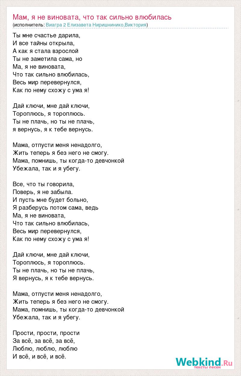 Ты мне счастье дарила, И все тайны открыла, А как я стала взрослой Ты не заметила сама, но Ма, я не виновата, Что так сильно влюбилась, Весь мир перевернулся, Как по нему схожу с ума я! Дай ключи, мне дай ключи, Тороплюсь, я тороплюсь. Ты не плачь, но ты не плачь, я вернусь, я к тебе вернусь. Мама, отпусти меня ненадолго, Жить теперь я без него не смогу. Мама, помнишь, ты когда-то девчонкой Убежала, так и я убегу. Все, что ты говорила, Поверь, я не забыла. И пусть мне будет больно, Я разберусь потом сама, ведь Ма, я не виновата, Что так сильно влюбилась, Весь мир перевернулся, Как по нему схожу с ума я! Дай ключи, мне дай ключи, Тороплюсь, я тороплюсь. Ты не плачь, но ты не плачь, Я вернусь, я к тебе вернусь. Мама, отпусти меня ненадолго, Жить теперь я без него не смогу. Мама, помнишь, ты когда-то девчонкой Убежала, так и я убегу. Прости, прости, прости За всё, за всё, за всё, Люблю, люблю, люблю И всё, и всё, и всё.
