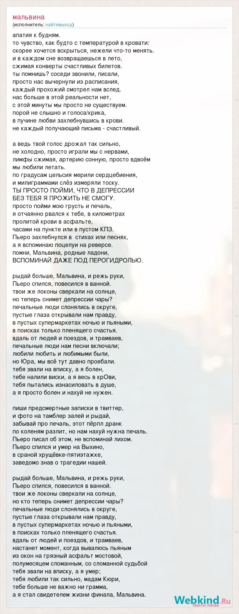 апатия к будням. то чувство, как будто с температурой в кровати: скорее хочется вскрыться, нежели что-то менять. и в каждом сне возвращаешься в лето, сжимая конверты счастливых билетов. ты помнишь? соседи звонили, писали, просто нас вычернули из расписания, каждый прохожий смотрел нам вслед. нас больше в этой реальности нет, с этой минуты мы просто не существуем. порой не слышно и голоса/крика, в пучине любви захлебнувшись в крови. не каждый получающий письма - счастливый. а ведь твой голос дрожал так сильно, не холодно, просто играли мы с нервами, лимфы сжимая, артерию сонную, просто вдвоём мы любили летать. по градусам цельсия мерили сердцебиения, и милиграммами слёз измеряли тоску. ТЫ ПРОСТО ПОЙМИ, ЧТО В ДЕПРЕССИИ БЕЗ ТЕБЯ Я ПРОЖИТЬ НЕ СМОГУ. просто пойми мою грусть и печаль, я отчаянно рвался к тебе, в километрах пролитой крови в асфальте, часами на пункте или в пустом КПЗ. Пьеро захлебнулся в стихах или песнях, а я вспоминаю поцелуи на реверсе. помни, Мальвина, родные ладони, ВСПОМИНАЙ ДАЖЕ ПОД ПЕРОГИДРОЛЬЮ. рыдай больше, Мальвина, и режь руки, Пьеро спился, повесился в ванной. твои же локоны сверкали на солнце, но теперь снимет депрессии чары? печальные люди слонялись в округе, пустые глаза открывали нам правду, в пустых супермаркетах ночью и пьяными, в поисках только пленящего счастья. вдаль от людей и поездов, и трамваев, печальные люди нам песни включали; любили любить и любимыми были, но Юра, мы всё тут давно проебали. тебя звали на вписку, а я болен, тебе налили виски, а я весь в крОви, тебя пытались изнасиловать в душе, а я просто болен и нахуй не нужен. пиши предсмертные записки в твиттер, и фото на тамблер залей и рыдай, забывай про печаль, этот пёрпл дранк по коленям разлит, но нам нахуй нужна печаль. Пьеро писал об этом, не вспоминай лихом. Пьеро спился и умер на Выхино, в сраной хрущёвке-пятиэтажке, заведомо знав о трагедии нашей. рыдай больше, Мальвина, и режь руки, Пьеро спился, повесился в ванной. твои же локоны сверкали на солнце, но кто теперь снимет депрессии чары? печальные люди слонялись в округе, пустые глаза открывали нам правду, в пустых супермаркетах ночью и пьяными, в поисках только пленящего счастья. вдаль от людей и поездов, и трамваев, настанет момент, когда вывалюсь пьяным из окон на грязный асфальт мостовой, полумесяцем сломанным, со сломанной судьбой тебя звали на вписку, а я умер; тебя любили так сильно, мадам Кюри, тебе больше не важно ни грамма, а я стал свидетелем жизни финала, Мальвина.