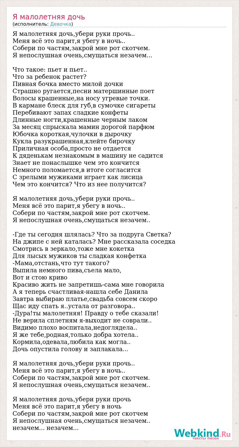 Я малолетняя дочь,убери руки прочь.. Меня всё это парит,я убегу в ночь.. Собери по частям,закрой мне рот скотчем. Я непослушная очень,смущаться незачем... Что такое: пьет и пьет.. Что за ребенок растет? Пивная бочка вместо милой дочки Страшно ругается,песни матершинные поет Волосы крашенные,на носу угревые точки. В кармане блеск для губ,в сумочке сигареты Перебивают запах сладкие конфеты Длинные ногти,крашенные черным лаком За месяц спрыскала мамин дорогой парфюм Юбочка короткая,чулочки в дырочку Кукла разукрашенная,клейте бирочку Приличная особа,просто не отдается К дяденькам незнакомым в машину не садится Знает не понаслышке чем это кончится Немного поломается,в итоге согласится С зрелыми мужиками играет как лисица Чем это кончится? Что из нее получится? Я малолетняя дочь,убери руки прочь.. Меня всё это парит,я убегу в ночь.. Собери по частям,закрой мне рот скотчем. Я непослушная очень,смущаться незачем.. -Где ты сегодня шлялась? Что за подруга Светка? На джипе с ней каталась? Мне рассказала соседка Смотрись в зеркало,тоже мне кокетка Для лысых мужиков ты сладкая конфетка -Мама,отстань,что тут такого? Выпила немного пива,съела мало, Вот и стою криво Красиво жить не запретишь-сама мне говорила А я теперь счастливая-нашла себе Данила Завтра выбираю платье,свадьба совсем скоро Щас иду спать я..устала от разговора.. -Дура!ты малолетняя! Правду о тебе сказали! Не верила сплетням я-выходит не соврали.. Видимо плохо воспитала,недоглядела.. Я же тебе,родная,только добра хотела.. Кормила,одевала,любила как могла.. Дочь опустила голову и заплакала... Я малолетняя дочь,убери руки прочь.. Меня всё это парит,я убегу в ночь.. Собери по частям,закрой мне рот скотчем. Я непослушная очень,смущаться незачем.. Я малолетняя дочь,убери руки прочь Меня всё это парит,я убегу в ночь Собери по частям,закрой мне рот скотчем Я непослушная очень,смущаться незачем.. незачем... незачем...
