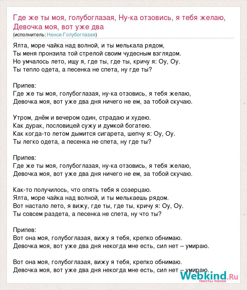 Ялта, море чайка над волной, и ты мелькала рядом, Ты меня пронзила той стрелой своим чудесным взглядом. Но умчалось лето, ищу я, где ты, где ты, кричу я: Оу, Оу. Ты тепло одета, а песенка не спета, ну где ты? Припев: Где же ты моя, голубоглазая, ну-ка отзовись, я тебя желаю, Девочка моя, вот уже два дня ничего не ем, за тобой скучаю. Утром, днём и вечером один, страдаю и худею. Как дурак, пословицей сужу и думкой богатею. Как когда-то летом дымится сигарета, шепчу я: Оу, Оу. Ты легко одета, а песенка не спета, ну где ты? Припев: Где же ты моя, голубоглазая, ну-ка отзовись, я тебя желаю, Девочка моя, вот уже два дня ничего не ем, за тобой скучаю. Как-то получилось, что опять тебя я созерцаю. Ялта, море чайка над волной, и ты мелькаешь рядом. Вот настало лето, я вижу, где ты, где ты, кричу я: Оу, Оу. Ты совсем раздета, а песенка не спета, ну что ты? Припев: Вот она моя, голубоглазая, вижу я тебя, крепко обнимаю. Девочка моя, вот уже два дня некогда мне есть, сил нет – умираю. Вот она моя, голубоглазая, вижу я тебя, крепко обнимаю. Девочка моя, вот уже два дня некогда мне есть, сил нет – умираю.
