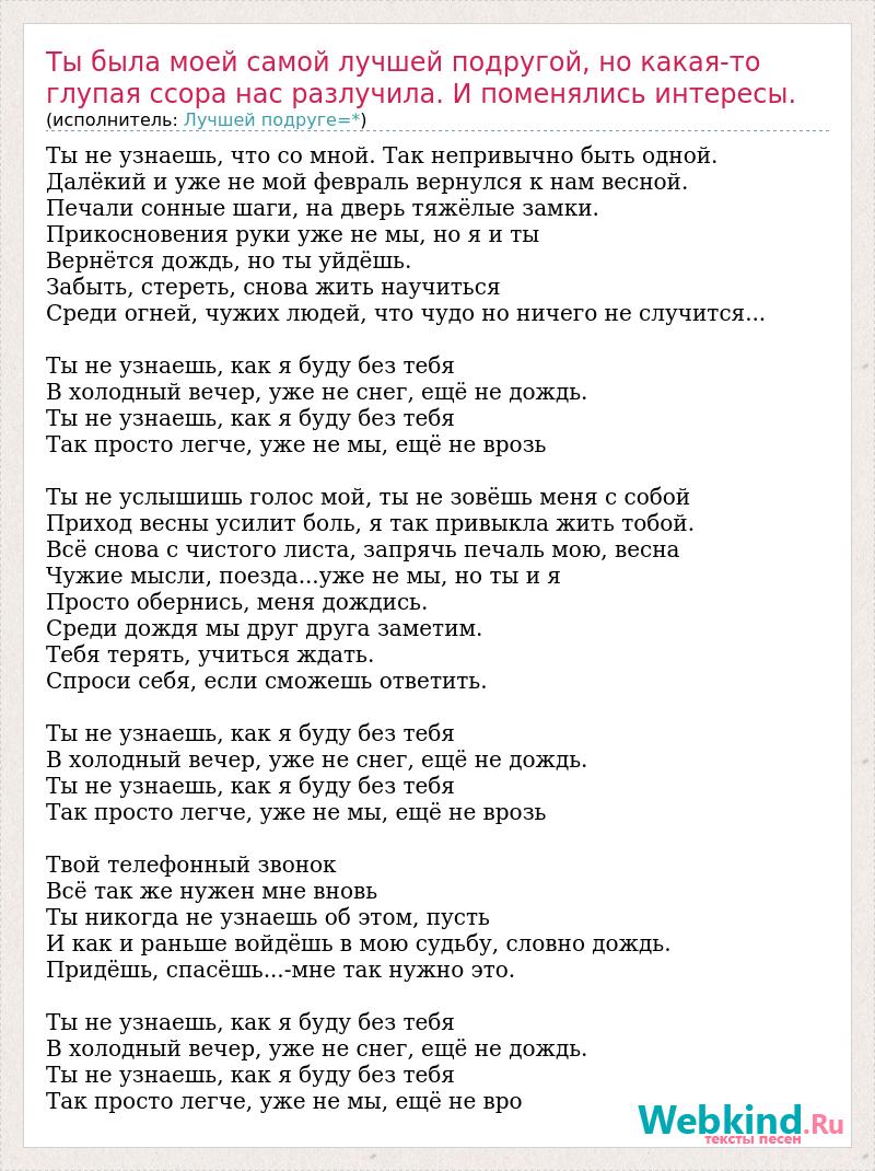 Ты не узнаешь, что со мной. Так непривычно быть одной. Далёкий и уже не мой февраль вернулся к нам весной. Печали сонные шаги, на дверь тяжёлые замки. Прикосновения руки уже не мы, но я и ты Вернётся дождь, но ты уйдёшь. Забыть, стереть, снова жить научиться Среди огней, чужих людей, что чудо но ничего не случится... Ты не узнаешь, как я буду без тебя В холодный вечер, уже не снег, ещё не дождь. Ты не узнаешь, как я буду без тебя Так просто легче, уже не мы, ещё не врозь Ты не услышишь голос мой, ты не зовёшь меня с собой Приход весны усилит боль, я так привыкла жить тобой. Всё снова с чистого листа, запрячь печаль мою, весна Чужие мысли, поезда...уже не мы, но ты и я Просто обернись, меня дождись. Среди дождя мы друг друга заметим. Тебя терять, учиться ждать. Спроси себя, если сможешь ответить. Ты не узнаешь, как я буду без тебя В холодный вечер, уже не снег, ещё не дождь. Ты не узнаешь, как я буду без тебя Так просто легче, уже не мы, ещё не врозь Твой телефонный звонок Всё так же нужен мне вновь Ты никогда не узнаешь об этом, пусть И как и раньше войдёшь в мою судьбу, словно дождь. Придёшь, спасёшь...-мне так нужно это. Ты не узнаешь, как я буду без тебя В холодный вечер, уже не снег, ещё не дождь. Ты не узнаешь, как я буду без тебя Так просто легче, уже не мы, ещё не вро