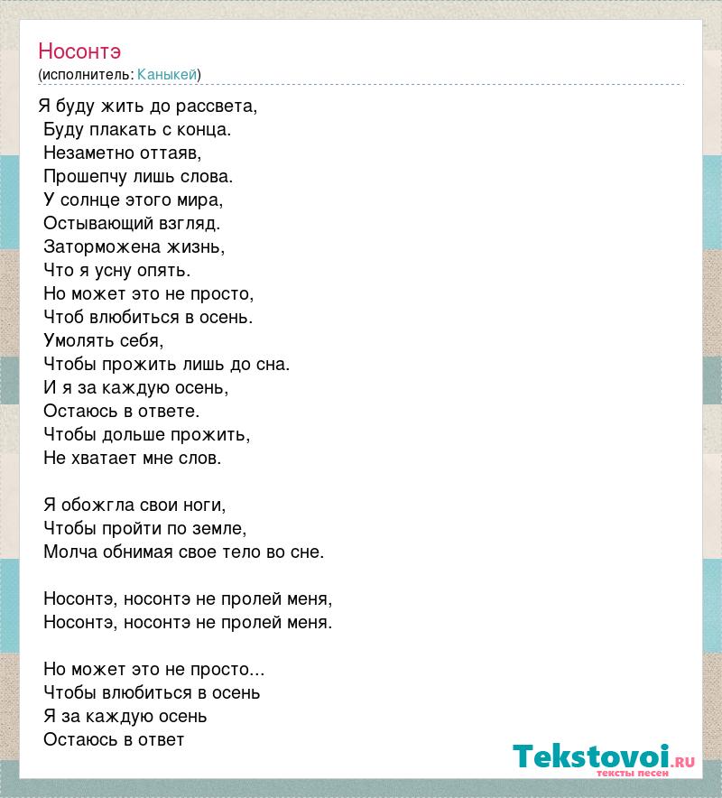 Я буду жить до рассвета, Буду плакать с конца. Незаметно оттаяв, Прошепчу лишь слова. У солнце этого мира, Остывающий взгляд. Заторможена жизнь, Что я усну опять. Но может это не просто, Чтоб влюбиться в осень. Умолять себя, Чтобы прожить лишь до сна. И я за каждую осень, Остаюсь в ответе. Чтобы дольше прожить, Не хватает мне слов. Я обожгла свои ноги, Чтобы пройти по земле, Молча обнимая свое тело во сне. Носонтэ, носонтэ не пролей меня, Носонтэ, носонтэ не пролей меня. Но может это не просто... Чтобы влюбиться в осень Я за каждую осень Остаюсь в ответ