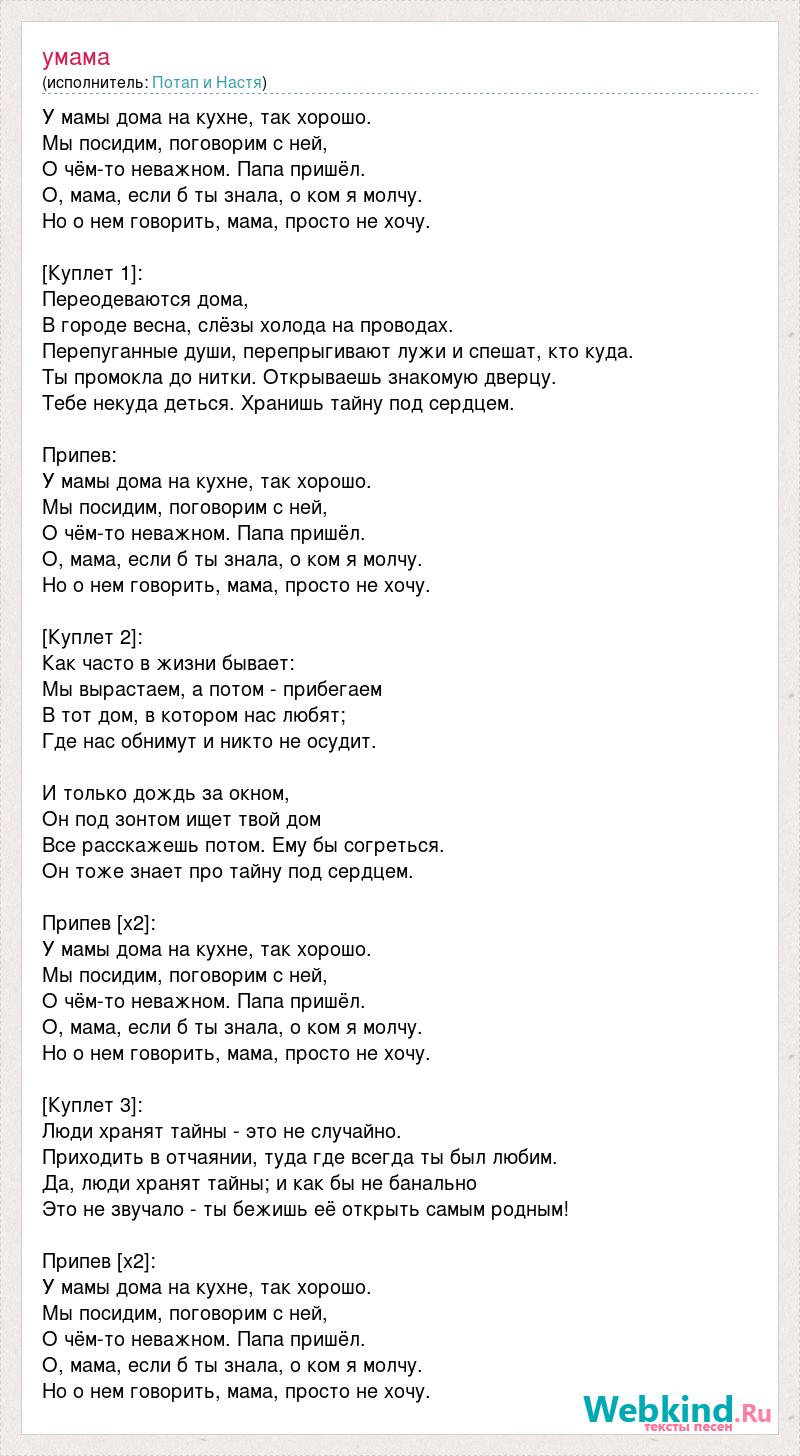 У мамы дома на кухне, так хорошо. Мы посидим, поговорим с ней, О чём-то неважном. Папа пришёл. О, мама, если б ты знала, о ком я молчу. Но о нем говорить, мама, просто не хочу. [Куплет 1]: Переодеваются дома, В городе весна, слёзы холода на проводах. Перепуганные души, перепрыгивают лужи и спешат, кто куда. Ты промокла до нитки. Открываешь знакомую дверцу. Тебе некуда деться. Хранишь тайну под сердцем. Припев: У мамы дома на кухне, так хорошо. Мы посидим, поговорим с ней, О чём-то неважном. Папа пришёл. О, мама, если б ты знала, о ком я молчу. Но о нем говорить, мама, просто не хочу. [Куплет 2]: Как часто в жизни бывает: Мы вырастаем, а потом - прибегаем В тот дом, в котором нас любят; Где нас обнимут и никто не осудит. И только дождь за окном, Он под зонтом ищет твой дом Все расскажешь потом. Ему бы согреться. Он тоже знает про тайну под сердцем. Припев [x2]: У мамы дома на кухне, так хорошо. Мы посидим, поговорим с ней, О чём-то неважном. Папа пришёл. О, мама, если б ты знала, о ком я молчу. Но о нем говорить, мама, просто не хочу. [Куплет 3]: Люди хранят тайны - это не случайно. Приходить в отчаянии, туда где всегда ты был любим. Да, люди хранят тайны; и как бы не банально Это не звучало - ты бежишь её открыть самым родным! Припев [x2]: У мамы дома на кухне, так хорошо. Мы посидим, поговорим с ней, О чём-то неважном. Папа пришёл. О, мама, если б ты знала, о ком я молчу. Но о нем говорить, мама, просто не хочу.