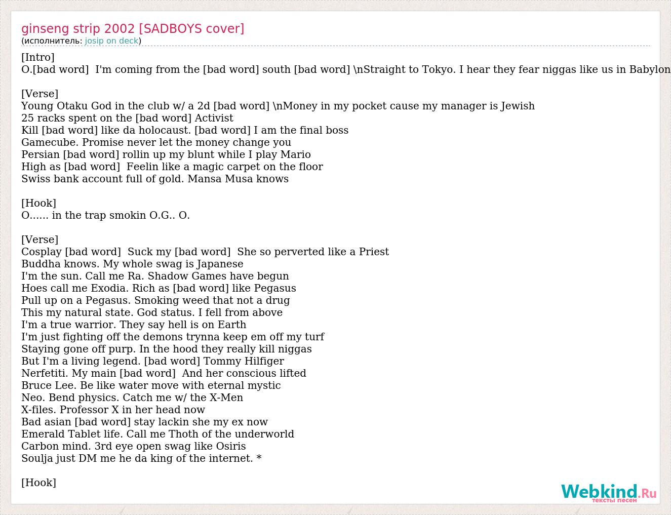 А как ты думаешь, о чем песня "Ginseng strip 2002 [SADBOYS cover]" ?