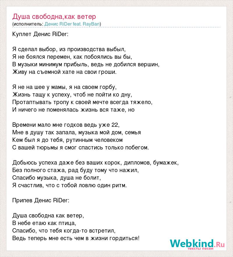 Куплет Денис RiDer: Я сделал выбор, из производства выбыл, Я не боялся перемен, как побоялись вы бы, В музыки минимум прибыль, ведь не добился вершин, Живу на съемной хате на свои гроши. Я не на шее у мамы, я на своем горбу, Жизнь тащу к успеху, чтоб не пойти ко дну, Протаптывать тропу к своей мечте всегда тяжело, И ничего не поменялась жизнь вся таже, но Времени мало мне годков ведь уже 22, Мне в душу так запала, музыка мой дом, семья Кем был я до тебя, рутинным человеком С вашей тюрьмы я смог спастись только побегом. Добьюсь успеха даже без ваших корок, дипломов, бумажек, Без полного стажа, рад буду тому что нажил, Спасибо музыка, душа не болит, Я счастлив, что с тобой ловлю один ритм. Припев Денис RiDer: Душа свободна как ветер, В небе етаю как птица, Спасибо, что тебя когда-то встретил, Ведь теперь мне есть чем в жизни гордиться!