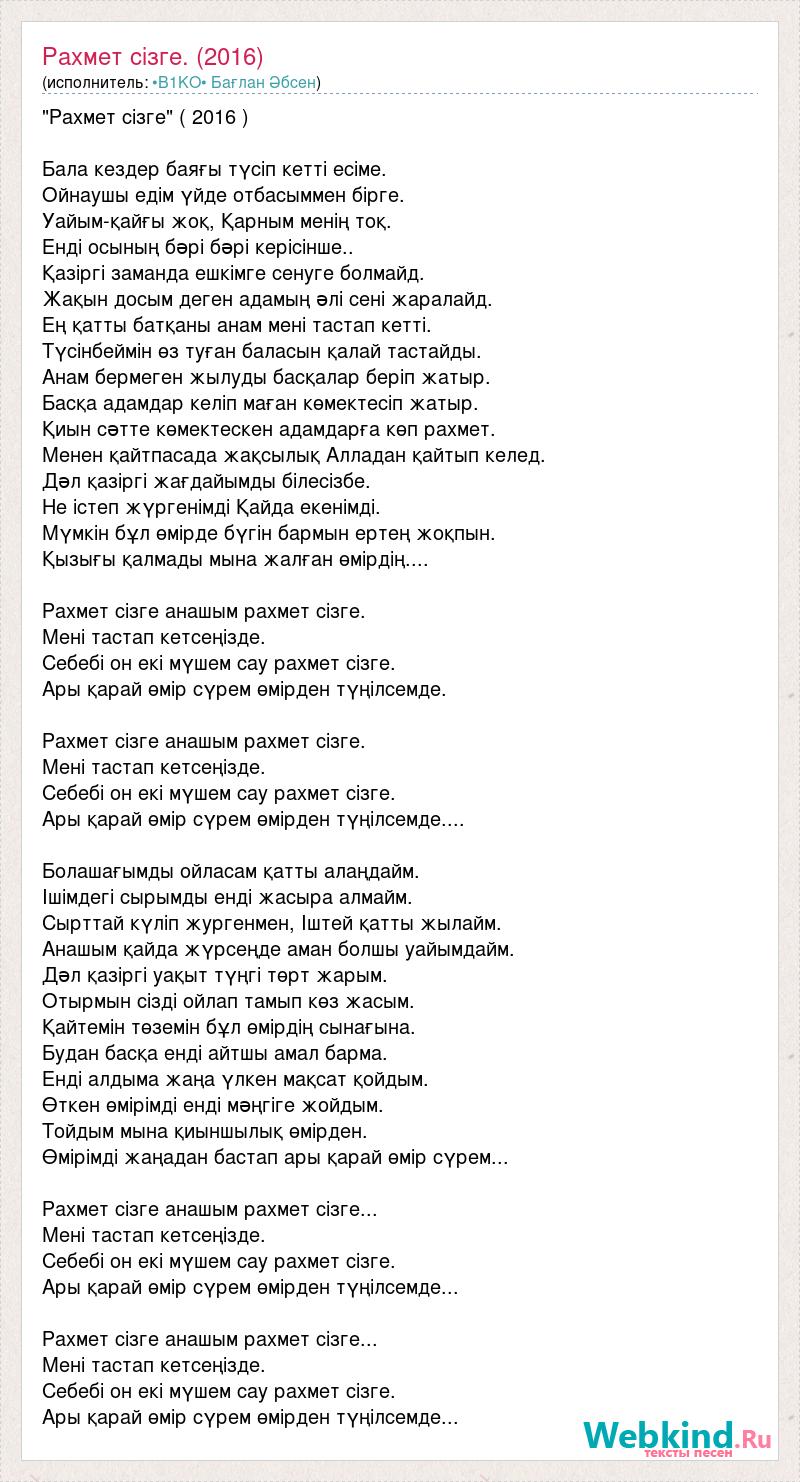 "Рахмет сізге" ( 2016 ) Бала кездер баяғы түсіп кетті есіме. Ойнаушы едім үйде отбасыммен бірге. Уайым-қайғы жоқ, Қарным менің тоқ. Енді осының бəрі бəрі керісінше.. Қазіргі заманда ешкімге сенуге болмайд. Жақын досым деген адамың əлі сені жаралайд. Ең қатты батқаны анам мені тастап кетті. Түсінбеймін өз туған баласын қалай тастайды. Анам бермеген жылуды басқалар беріп жатыр. Басқа адамдар келіп маған көмектесіп жатыр. Қиын сəтте көмектескен адамдарға көп рахмет. Менен қайтпасада жақсылық Алладан қайтып келед. Дəл қазіргі жағдайымды білесізбе. Не істеп жүргенімді Қайда екенімді. Мүмкін бұл өмірде бүгін бармын ертең жоқпын. Қызығы қалмады мына жалған өмірдің.... Рахмет сізге анашым рахмет сізге. Мені тастап кетсеңізде. Себебі он екі мүшем сау рахмет сізге. Ары қарай өмір сүрем өмірден түңілсемде. Рахмет сізге анашым рахмет сізге. Мені тастап кетсеңізде. Себебі он екі мүшем сау рахмет сізге. Ары қарай өмір сүрем өмірден түңілсемде.... Болашағымды ойласам қатты алаңдайм. Ішімдегі сырымды енді жасыра алмайм. Сырттай күліп жургенмен, Іштей қатты жылайм. Анашым қайда жүрсеңде аман болшы уайымдайм. Дəл қазіргі уақыт түңгі төрт жарым. Отырмын сізді ойлап тамып көз жасым. Қайтемін төземін бұл өмірдің сынағына. Будан басқа енді айтшы амал барма. Енді алдыма жаңа үлкен мақсат қойдым. Өткен өмірімді енді мəңгіге жойдым. Тойдым мына қиыншылық өмірден. Өмірімді жаңадан бастап ары қарай өмір сүрем... Рахмет сізге анашым рахмет сізге... Мені тастап кетсеңізде. Себебі он екі мүшем сау рахмет сізге. Ары қарай өмір сүрем өмірден түңілсемде... Рахмет сізге анашым рахмет сізге... Мені тастап кетсеңізде. Себебі он екі мүшем сау рахмет сізге. Ары қарай өмір сүрем өмірден түңілсемде...