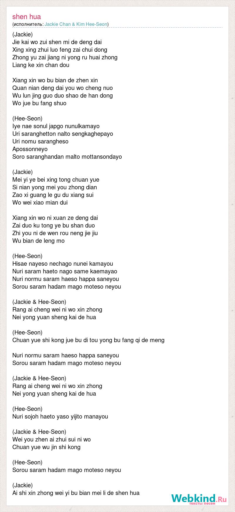 (Jackie) Jie kai wo zui shen mi de deng dai Xing xing zhui luo feng zai chui dong Zhong yu zai jiang ni yong ru huai zhong Liang ke xin chan dou Xiang xin wo bu bian de zhen xin Quan nian deng dai you wo cheng nuo Wu lun jing guo duo shao de han dong Wo jue bu fang shuo (Hee-Seon) Iye nae sonul japgo nunulkamayo Uri saranghetton nalto sengkaghepayo Uri nomu sarangheso Apossonneyo Soro saranghandan malto mottansondayo (Jackie) Mei yi ye bei xing tong chuan yue Si nian yong mei you zhong dian Zao xi guang le gu du xiang sui Wo wei xiao mian dui Xiang xin wo ni xuan ze deng dai Zai duo ku tong ye bu shan duo Zhi you ni de wen rou neng jie jiu Wu bian de leng mo (Hee-Seon) Hisae nayeso nechago nunei kamayou Nuri saram haeto nago same kaemayao Nuri normu saram haeso happa saneyou Sorou saram hadam mago moteso neyou (Jackie & Hee-Seon) Rang ai cheng wei ni wo xin zhong Nei yong yuan sheng kai de hua (Hee-Seon) Chuan yue shi kong jue bu di tou yong bu fang qi de meng Nuri normu saram haeso happa saneyou Sorou saram hadam mago moteso neyou (Jackie & Hee-Seon) Rang ai cheng wei ni wo xin zhong Nei yong yuan sheng kai de hua (Hee-Seon) Nuri sojoh haeto yaso yijito manayou (Jackie & Hee-Seon) Wei you zhen ai zhui sui ni wo Chuan yue wu jin shi kong (Hee-Seon) Sorou saram hadam mago moteso neyou (Jackie) Ai shi xin zhong wei yi bu bian mei li de shen hua