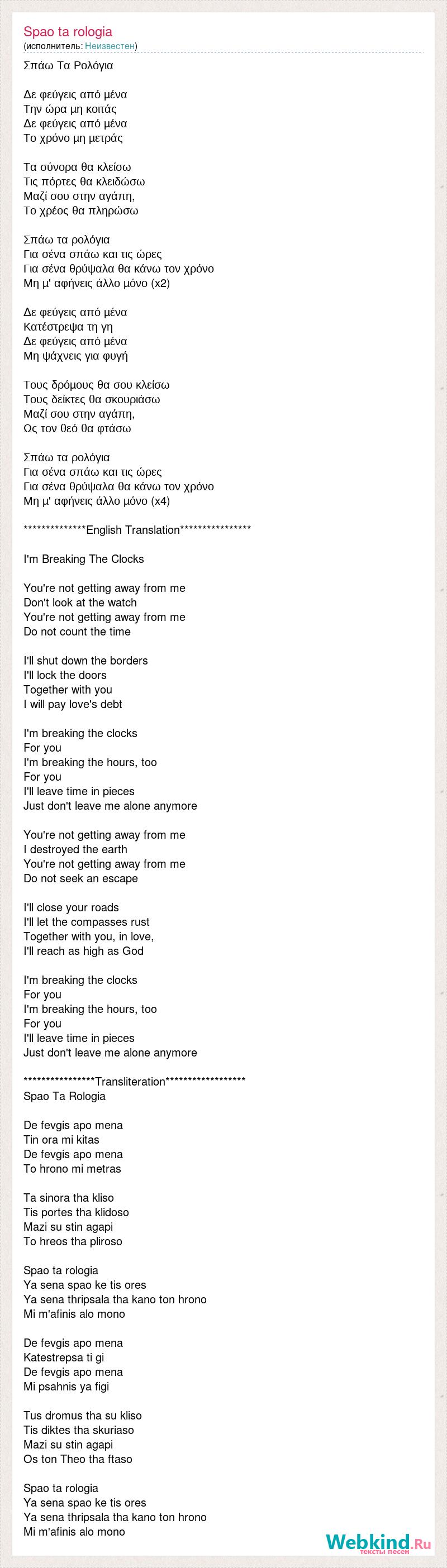 Σπάω Τα Ρολόγια Δε φεύγεις από μένα Την ώρα μη κοιτάς Δε φεύγεις από μένα Το χρόνο μη μετράς Τα σύνορα θα κλείσω Τις πόρτες θα κλειδώσω Μαζί σου στην αγάπη, Το χρέος θα πληρώσω Σπάω τα ρολόγια Για σένα σπάω και τις ώρες Για σένα θρύψαλα θα κάνω τον χρόνο Μη μ' αφήνεις άλλο μόνο (x2) Δε φεύγεις από μένα Κατέστρεψα τη γη Δε φεύγεις από μένα Μη ψάχνεις για φυγή Τους δρόμους θα σου κλείσω Τους δείκτες θα σκουριάσω Μαζί σου στην αγάπη, Ως τον θεό θα φτάσω Σπάω τα ρολόγια Για σένα σπάω και τις ώρες Για σένα θρύψαλα θα κάνω τον χρόνο Μη μ' αφήνεις άλλο μόνο (x4) **************English Translation**************** I'm Breaking The Clocks You're not getting away from me Don't look at the watch You're not getting away from me Do not count the time I'll shut down the borders I'll lock the doors Together with you I will pay love's debt I'm breaking the clocks For you I'm breaking the hours, too For you I'll leave time in pieces Just don't leave me alone anymore You're not getting away from me I destroyed the earth You're not getting away from me Do not seek an escape I'll close your roads I'll let the compasses rust Together with you, in love, I'll reach as high as God I'm breaking the clocks For you I'm breaking the hours, too For you I'll leave time in pieces Just don't leave me alone anymore ****************Transliteration****************** Spao Ta Rologia De fevgis apo mena Tin ora mi kitas De fevgis apo mena To hrono mi metras Ta sinora tha kliso Tis portes tha klidoso Mazi su stin agapi To hreos tha pliroso Spao ta rologia Ya sena spao ke tis ores Ya sena thripsala tha kano ton hrono Mi m'afinis alo mono De fevgis apo mena Katestrepsa ti gi De fevgis apo mena Mi psahnis ya figi Tus dromus tha su kliso Tis diktes tha skuriaso Mazi su stin agapi Os ton Theo tha ftaso Spao ta rologia Ya sena spao ke tis ores Ya sena thripsala tha kano ton hrono Mi m'afinis alo mono