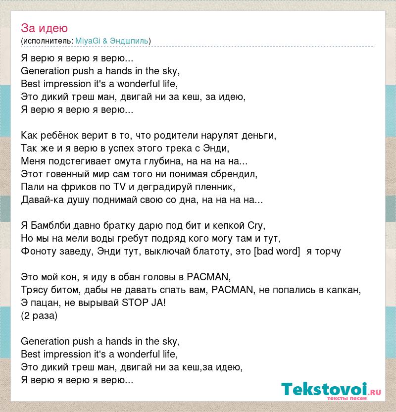 Я верю я верю я верю... Generation push a hands in the sky, Best impression it's a wonderful life, Это дикий треш ман, двигай ни за кеш, за идею, Я верю я верю я верю... Как ребёнок верит в то, что родители нарулят деньги, Так же и я верю в успех этого трека с Энди, Меня подстегивает омута глубина, на на на на... Этот говенный мир сам того ни понимая сбрендил, Пали на фриков по TV и деградируй пленник, Давай-ка душу поднимай свою со дна, на на на на... Я Бамблби давно братку дарю под бит и кепкой Cry, Но мы на мели воды гребут подряд кого могу там и тут, Фоноту заведу, Энди тут, выключай блатоту, это [bad word] я торчу Это мой кон, я иду в обан головы в PACMAN, Трясу битом, дабы не давать спать вам, PACMAN, не попались в капкан, Э пацан, не вырывай STOP JA! (2 раза) Generation push a hands in the sky, Best impression it's a wonderful life, Это дикий треш ман, двигай ни за кеш,за идею, Я верю я верю я верю...