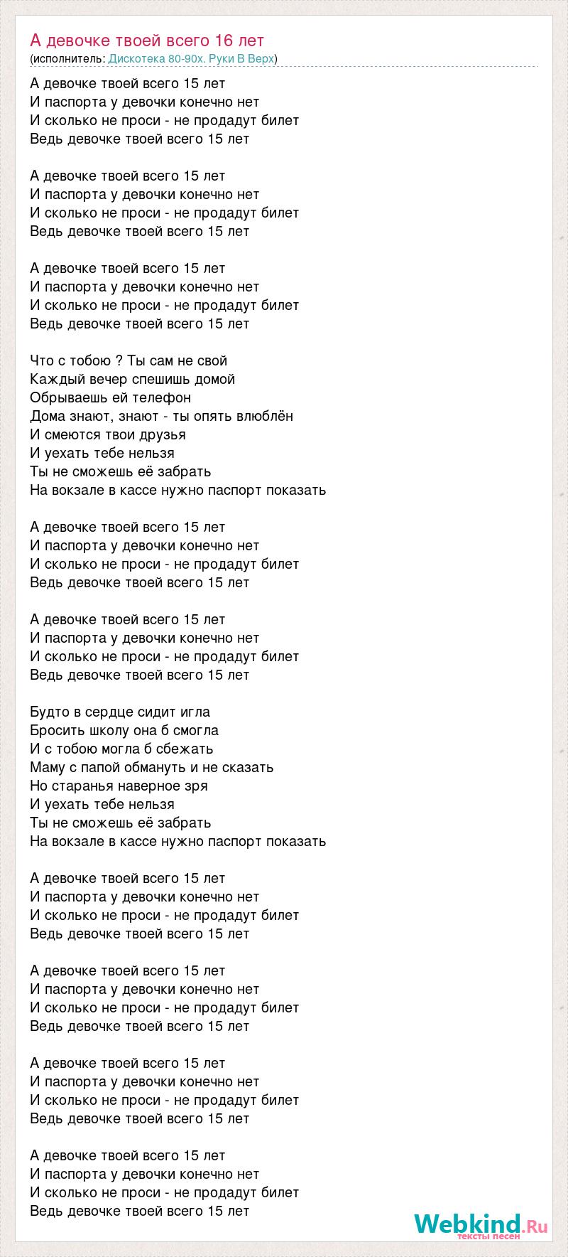 А девочке твоей всего 15 лет И паспорта у девочки конечно нет И сколько не проси - не продадут билет Ведь девочке твоей всего 15 лет А девочке твоей всего 15 лет И паспорта у девочки конечно нет И сколько не проси - не продадут билет Ведь девочке твоей всего 15 лет А девочке твоей всего 15 лет И паспорта у девочки конечно нет И сколько не проси - не продадут билет Ведь девочке твоей всего 15 лет Что с тобою ? Ты сам не свой Каждый вечер спешишь домой Обрываешь ей телефон Дома знают, знают - ты опять влюблён И смеются твои друзья И уехать тебе нельзя Ты не сможешь её забрать На вокзале в кассе нужно паспорт показать А девочке твоей всего 15 лет И паспорта у девочки конечно нет И сколько не проси - не продадут билет Ведь девочке твоей всего 15 лет А девочке твоей всего 15 лет И паспорта у девочки конечно нет И сколько не проси - не продадут билет Ведь девочке твоей всего 15 лет Будто в сердце сидит игла Бросить школу она б смогла И с тобою могла б сбежать Маму с папой обмануть и не сказать Но старанья наверное зря И уехать тебе нельзя Ты не сможешь её забрать На вокзале в кассе нужно паспорт показать А девочке твоей всего 15 лет И паспорта у девочки конечно нет И сколько не проси - не продадут билет Ведь девочке твоей всего 15 лет А девочке твоей всего 15 лет И паспорта у девочки конечно нет И сколько не проси - не продадут билет Ведь девочке твоей всего 15 лет А девочке твоей всего 15 лет И паспорта у девочки конечно нет И сколько не проси - не продадут билет Ведь девочке твоей всего 15 лет А девочке твоей всего 15 лет И паспорта у девочки конечно нет И сколько не проси - не продадут билет Ведь девочке твоей всего 15 лет