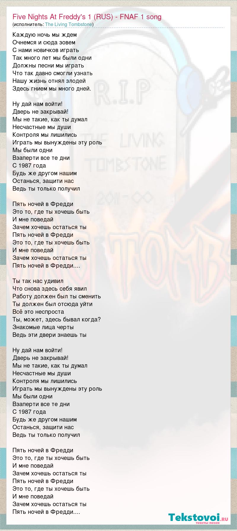 Каждую ночь мы ждем Очнемся и сюда зовем С нами новичков играть Так много лет мы были одни Должны песни мы играть Что так давно смогли узнать Нашу жизнь отнял злодей Здесь гнием мы много дней. Ну дай нам войти! Дверь не закрывай! Мы не такие, как ты думал Несчастные мы души Контроля мы лишились Играть мы вынуждены эту роль Мы были одни Взаперти все те дни С 1987 года Будь же другом нашим Останься, защити нас Ведь ты только получил Пять ночей в Фредди Это то, где ты хочешь быть И мне поведай Зачем хочешь остаться ты Пять ночей в Фредди Это то, где ты хочешь быть И мне поведай Зачем хочешь остаться ты Пять ночей в Фредди.... Ты так нас удивил Что снова здесь себя явил Работу должен был ты сменить Ты должен был отсюда уйти Всё это неспроста Ты, может, здесь бывал когда? Знакомые лица черты Ведь эти двери знаешь ты Ну дай нам войти! Дверь не закрывай! Мы не такие, как ты думал Несчастные мы души Контроля мы лишились Играть мы вынуждены эту роль Мы были одни Взаперти все те дни С 1987 года Будь же другом нашим Останься, защити нас Ведь ты только получил Пять ночей в Фредди Это то, где ты хочешь быть И мне поведай Зачем хочешь остаться ты Пять ночей в Фредди Это то, где ты хочешь быть И мне поведай Зачем хочешь остаться ты Пять ночей в Фредди....