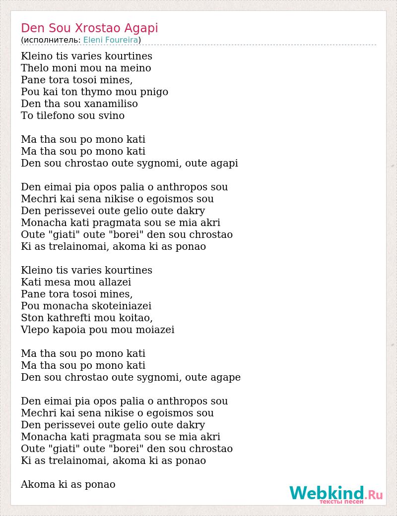А как ты думаешь, о чем песня "Den Sou Xrostao Agapi" ?