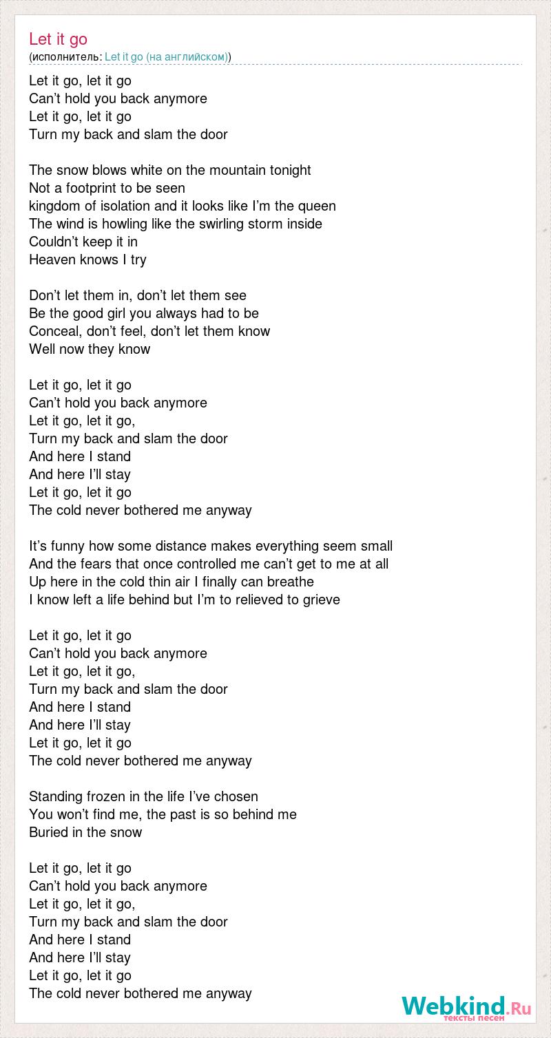 Let it go, let it go Can’t hold you back anymore Let it go, let it go Turn my back and slam the door The snow blows white on the mountain tonight Not a footprint to be seen kingdom of isolation and it looks like I’m the queen The wind is howling like the swirling storm inside Couldn’t keep it in Heaven knows I try Don’t let them in, don’t let them see Be the good girl you always had to be Conceal, don’t feel, don’t let them know Well now they know Let it go, let it go Can’t hold you back anymore Let it go, let it go, Turn my back and slam the door And here I stand And here I’ll stay Let it go, let it go The cold never bothered me anyway It’s funny how some distance makes everything seem small And the fears that once controlled me can’t get to me at all Up here in the cold thin air I finally can breathe I know left a life behind but I’m to relieved to grieve Let it go, let it go Can’t hold you back anymore Let it go, let it go, Turn my back and slam the door And here I stand And here I’ll stay Let it go, let it go The cold never bothered me anyway Standing frozen in the life I’ve chosen You won’t find me, the past is so behind me Buried in the snow Let it go, let it go Can’t hold you back anymore Let it go, let it go, Turn my back and slam the door And here I stand And here I’ll stay Let it go, let it go The cold never bothered me anyway