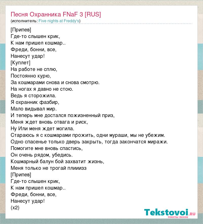 [Припев] Где-то слышен крик, К нам пришел кошмар.. Фреди, бонни, все, Нанесут удар! [Куплет] На работе не сплю, Постоянно курю, За кошмарами снова и снова смотрю. На ногах я давно не стою. Ведь я сторожила. Я охранник фазбир, Мало видывал мир. И теперь мне достался пожизненный приз, Меня ждет вновь отвага и риск, Ну Или меня ждет могила. Стараюсь я с кошмарами прожить, одни мураши, мы не убежим. Одно спасенье только дверь закрыть, тогда закончатся миражи. Помогите мне вновь спастись, Он очень рядом, убедись. Кошмарный балун бой захватит жизнь, Меня только не трогай плииизз [Припев] Где-то слышен крик, К нам пришел кошмар.. Фреди, бонни, все, Нанесут удар! (x2)