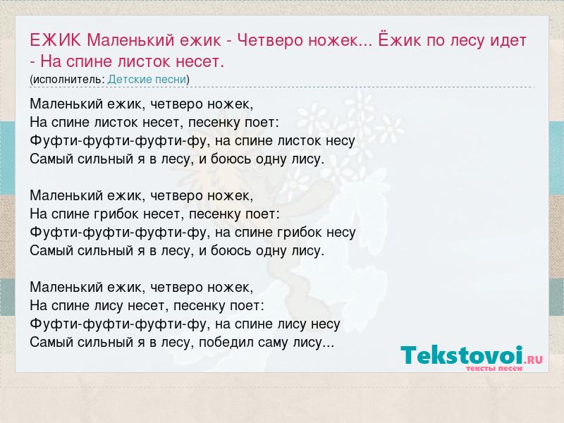Маленький ежик, четверо ножек, На спине листок несет, песенку поет: Фуфти-фуфти-фуфти-фу, на спине листок несу Самый сильный я в лесу, и боюсь одну лису. Маленький ежик, четверо ножек, На спине грибок несет, песенку поет: Фуфти-фуфти-фуфти-фу, на спине грибок несу Самый сильный я в лесу, и боюсь одну лису. Маленький ежик, четверо ножек, На спине лису несет, песенку поет: Фуфти-фуфти-фуфти-фу, на спине лису несу Самый сильный я в лесу, победил саму лису...