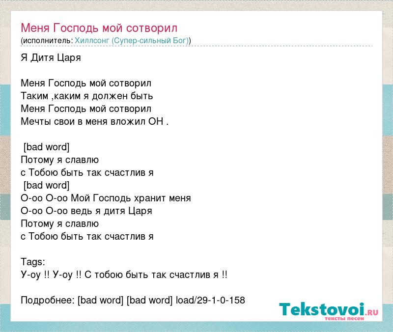 Я Дитя Царя Меня Господь мой сотворил Таким ,каким я должен быть Меня Господь мой сотворил Мечты свои в меня вложил ОН . [bad word] Потому я славлю с Тобою быть так счастлив я [bad word] О-оо О-оо Мой Господь хранит меня О-оо О-оо ведь я дитя Царя Потому я славлю с Тобою быть так счастлив я Tags: У-оу !! У-оу !! С тобою быть так счастлив я !! Подробнее: [bad word] [bad word] load/29-1-0-158