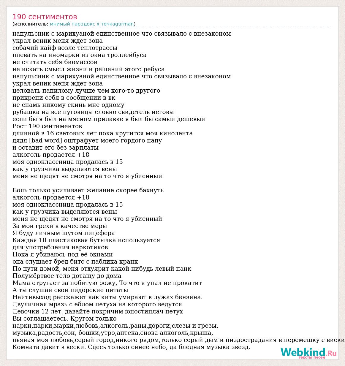 напульсник с марихуаной единственное что связывало с внезаконом украл веник меня ждет зона собачий кайф возле теплотрассы плевать на иномарки из окна троллейбуса не считать себя биомассой не искать смысл жизни и решений этого ребуса напульсник с марихуаной единственное что связывало с внезаконом украл веник меня ждет зона целовать папилому лучше чем кого-то другого прикрепи себя в сообщении в вк не спамь никому скинь мне одному рубашка на все пуговицы словно свидетель иеговы если бы я был на мясном прилавке я был бы самый дешевый Рост 190 сентиментов длинной в 16 световых лет пока крутится моя кинолента дядя [bad word] оштрафует моего гордого папу и оставит его без зарплаты алкоголь продается +18 моя одноклассница продалась в 15 как у грузчика выделяются вены меня не щедят не смотря на то что я убиенный Боль только усиливает желание скорее бахнуть алкоголь продается +18 моя одноклассница продалась в 15 как у грузчика выделяются вены меня не щедят не смотря на то что я убиенный За мои грехи в качестве меры Я буду личным шутом лицефера Каждая 10 пластиковая бутылка используется для употребления наркотиков Пока я убиваюсь под её окнами она слушает бред битс с паблика кранк По пути домой, меня отхуярит какой нибудь левый панк Полумёртвое тело дотащу до дома Мама отругает за побитую рожу, То что я упал не прокатит А ты слушай свои пидорские цитаты Найтивыход расскажет как киты умирают в лужах бензина. Двуличная мразь с еблом петуха на которого ведутся Девочки 12 лет, давайте покричим юностиплач петух Вы соглашаетесь. Кругом только нарки,парки,марки,любовь,алкоголь,раны,дороги,слезы и грезы, музыка,радость,сон, бошки,утро,аптека,снова алкоголь,крыша, пьяная моя любовь,серый город,никого рядом,только серый дым и пиздострадания в перемешку с виски Комната давит в вески. Сдесь только синее небо, да бледная музыка звезд.