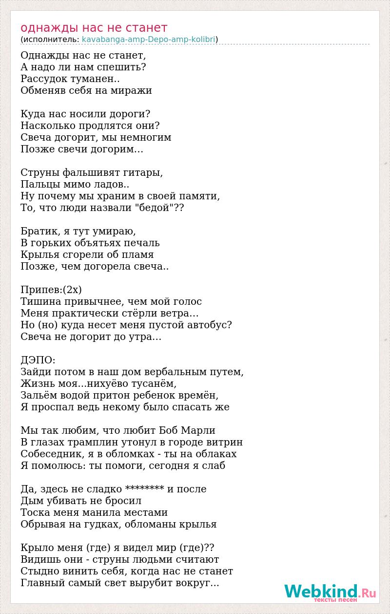 Однажды нас не станет, А надо ли нам спешить? Рассудок туманен.. Обменяв себя на миражи Куда нас носили дороги? Насколько продлятся они? Свеча догорит, мы немногим Позже свечи догорим… Струны фальшивят гитары, Пальцы мимо ладов.. Ну почему мы храним в своей памяти, То, что люди назвали "бедой"?? Братик, я тут умираю, В горьких объятьях печаль Крылья сгорели об пламя Позже, чем догорела свеча.. Припев:(2х) Тишина привычнее, чем мой голос Меня практически стёрли ветра… Но (но) куда несет меня пустой автобус? Свеча не догорит до утра… ДЭПО: Зайди потом в наш дом вербальным путем, Жизнь моя...нихуёво тусанём, Зальём водой притон ребенок времён, Я проспал ведь некому было спасать же Мы так любим, что любит Боб Марли В глазах трамплин утонул в городе витрин Собеседник, я в обломках - ты на облаках Я помолюсь: ты помоги, сегодня я слаб Да, здесь не сладко ******** и после Дым убивать не бросил Тоска меня манила местами Обрывая на гудках, обломаны крылья Крыло меня (где) я видел мир (где)?? Видишь они - струны людьми считают Стыдно винить себя, когда нас не станет Главный самый свет вырубит вокруг...