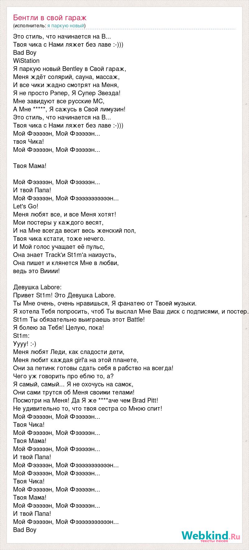 Это стиль, что начинается на В... Твоя чика с Нами ляжет без лаве :-))) Bad Boy WiStation Я паркую новый Bentley в Свой гараж, Меня ждёт солярий, сауна, массаж, И все чики жадно смотрят на Меня, Я не просто Рэпер, Я Супер Звезда! Мне завидуют все русские MC, А Мне *****, Я сажусь в Свой лимузин! Это стиль, что начинается на В... Твоя чика с Нами ляжет без лаве :-))) Мой Фэээээн, Мой Фэээээн... твоя Чика! Мой Фэээээн, Мой Фэээээн... Твоя Мама! Мой Фэээээн, Мой Фэээээн... И твой Папа! Мой Фэээээн, Мой Фэээээээээээн... Let's Go! Меня любят все, и все Меня хотят! Мои постеры у каждого весят, И на Мне всегда весит весь женский пол, Твоя чика кстати, тоже нечего. И Мой голос учащает её пульс, Она знает Track'и St1m'a наизусть, Она пишет и клянется Мне в любви, ведь это Вииии! Девушка Labore: Привет St1m! Это Девушка Labore. Ты Мне очень, очень нравишься, Я фанатею от Твоей музыки. Я хотела Тебя попросить, чтоб Ты выслал Мне Ваш диск с подписями, и постер. St1m Ты обязательно выиграешь этот Battle! Я болею за Тебя! Целую, пока! St1m: Уууу! :-) Меня любят Леди, как сладости дети, Меня любит каждая girl'a на этой планете, Они за петинк готовы сдать себя в рабство на всегда! Чего уж говорить про еблю то, а? Я самый, самый... Я не охочусь на самок, Они сами трутся об Меня своими телами! Посмотри на Меня! Да Я же ****аче чем Brad Pitt! Не удивительно то, что твоя сестра со Мною спит! Мой Фэээээн, Мой Фэээээн... Твоя Чика! Мой Фэээээн, Мой Фэээээн... Твоя Мама! Мой Фэээээн, Мой Фэээээн... И твой Папа! Мой Фэээээн, Мой Фэээээээээээн... Мой Фэээээн, Мой Фэээээн... Твоя Чика! Мой Фэээээн, Мой Фэээээн... Твоя Мама! Мой Фэээээн, Мой Фэээээн... И твой Папа! Мой Фэээээн, Мой Фэээээээээээн... Bad Boy