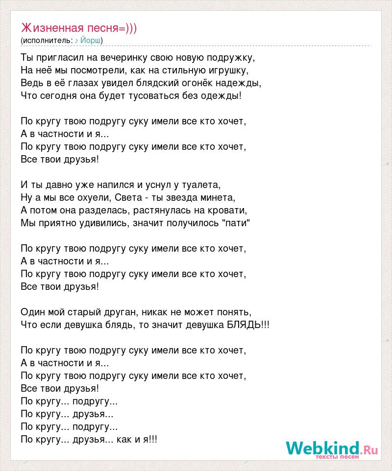 Ты пригласил на вечеринку свою новую подружку, На неё мы посмотрели, как на стильную игрушку, Ведь в её глазах увидел блядский огонёк надежды, Что сегодня она будет тусоваться без одежды! По кругу твою подругу суку имели все кто хочет, А в частности и я... По кругу твою подругу суку имели все кто хочет, Все твои друзья! И ты давно уже напился и уснул у туалета, Ну а мы все охуели, Света - ты звезда минета, А потом она разделась, растянулась на кровати, Мы приятно удивились, значит получилось "пати" По кругу твою подругу суку имели все кто хочет, А в частности и я... По кругу твою подругу суку имели все кто хочет, Все твои друзья! Один мой старый друган, никак не может понять, Что если девушка блядь, то значит девушка БЛЯДЬ!!! По кругу твою подругу суку имели все кто хочет, А в частности и я... По кругу твою подругу суку имели все кто хочет, Все твои друзья! По кругу... подругу... По кругу... друзья... По кругу... подругу... По кругу... друзья... как и я!!!