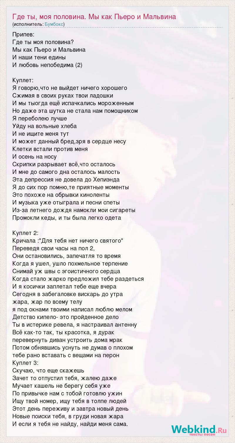 Припев: Где ты моя половина? Мы как Пьеро и Мальвина И наши тени едины И любовь непобедима (2) Куплет: Я говорю,что не выйдет ничего хорошего Сжимая в своих руках твои ладошки И мы тыогда ещё испачкались мороженным Но даже эта шутка не стала нам помощником Я переболею лучше Уйду на вольные хлеба И не ищите меня тут И может данный бред,зря в сердце несу Клетки встали против меня И осень на носу Скрипки разрывает всё,что осталось И мне до самого дна осталось малость Эта депрессия не довела до Хепиэнда Я до сих пор помню,те приятные моменты Это похоже на обрывки киноленты И музыка уже отыграла и песни спеты Из-за летнего дождя намокли мои сигареты Промокли кеды, и ты была легко одета Куплет 2: Кричала :"Для тебя нет ничего святого" Переведя свои часы на пол 2, Они остановились, запечатля то время Когда я ушел, ушло похмельное терпение Снимай уж швы с эгоистичного сердца Когда стало жарко предложил тебе раздеться И я косички заплетал тебе еще вчера Сегодня в забегаловке вискарь до утра жара, жар по всему телу я под окнами твоими написал люблю мелом Детство кипело- это пройденное дело Ты в истерике ревела, я настраивал антенну Всё как-то так, ты красотка, я дурак перевернуть диван устроить дома мрак Потом обнявшись уснуть не думав о плохом тебе рано вставать с вещами на перон Куплет 3: Скучаю, что еще скажешь Зачет то отпустил тебя, жалею даже Мучает кашель не берегу себя уже По привычке нам с тобой готовлю ужин Ищу твой номер, ищу тебя в толпе людей Этот день переживу и завтра новый день Новые поиски тебя, в груди новая жара И если я тебя не найду, найди меня сама.