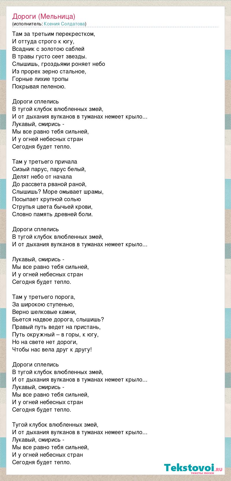 Там за третьим перекрестком, И оттуда строго к югу, Всадник с золотою саблей В травы густо сеет звезды. Слышишь, гроздьями роняет небо Из прорех зерно стальное, Горные лихие тропы Покрывая пеленою. Дороги сплелись В тугой клубок влюбленных змей, И от дыхания вулканов в туманах немеет крыло... Лукавый, смирись - Мы все равно тебя сильней, И у огней небесных стран Сегодня будет тепло. Там у третьего причала Сизый парус, парус белый, Делят небо от начала До рассвета рваной раной, Слышишь? Море омывает шрамы, Посыпает крупной солью Струпья цвета бычьей крови, Словно память древней боли. Дороги сплелись В тугой клубок влюбленных змей, И от дыхания вулканов в туманах немеет крыло... Лукавый, смирись - Мы все равно тебя сильней, И у огней небесных стран Сегодня будет тепло. Там у третьего порога, За широкою ступенью, Верно шелковые камни, Бьется надвое дорога, слышишь? Правый путь ведет на пристань, Путь окружный – в горы, к югу, Но на свете нет дороги, Чтобы нас вела друг к другу! Дороги сплелись В тугой клубок влюбленных змей, И от дыхания вулканов в туманах немеет крыло... Лукавый, смирись - Мы все равно тебя сильней, И у огней небесных стран Сегодня будет тепло. Тугой клубок влюбленных змей, И от дыхания вулканов в туманах немеет крыло... Лукавый, смирись - Мы все равно тебя сильней, И у огней небесных стран Сегодня будет тепло.