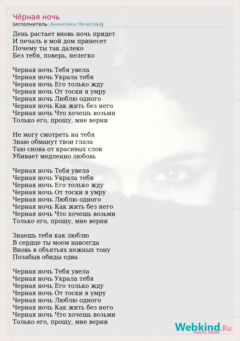 День растает вновь ночь придет И печаль в мой дом принесет Почему ты так далеко Без тебя, поверь, нелегко Черная ночь Тебя увела Черная ночь Украла тебя Черная ночь Его только жду Черная ночь От тоски я умру Черная ночь Люблю одного Черная ночь Как жить без него Черная ночь Что хочешь возьми Только его, прошу, мне верни Не могу смотреть на тебя Знаю обманут твои глаза Таю снова от красивых слов Убивает медленно любовь Черная ночь Тебя увела Черная ночь Украла тебя Черная ночь Его только жду Черная ночь От тоски я умру Черная ночь Люблю одного Черная ночь Как жить без него Черная ночь Что хочешь возьми Только его, прошу, мне верни Знаешь тебя как люблю В сердце ты моем навсегда Вновь в объятьях нежных тону Позабыв обиды едва Черная ночь Тебя увела Черная ночь Украла тебя Черная ночь Его только жду Черная ночь От тоски я умру Черная ночь Люблю одного Черная ночь Как жить без него Черная ночь Что хочешь возьми Только его, прошу, мне верни