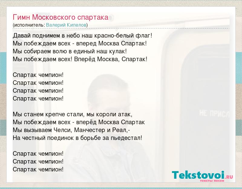 Давай поднимем в небо наш красно-белый флаг! Мы побеждаем всех - вперед Москва Спартак! Мы собираем волю в единый наш кулак! Мы побеждаем всех! Вперёд Москва, Спартак! Спартак чемпион! Спартак чемпион! Спартак чемпион! Спартак чемпион! Мы станем крепче стали, мы короли атак, Мы побеждаем всех - вперёд Москва Спартак Мы вызываем Челси, Манчестер и Реал,- На честный поединок в борьбе за пьедестал! Спартак чемпион! Спартак чемпион! Спартак чемпион!