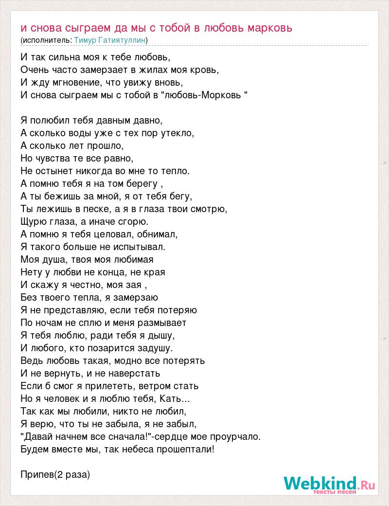 И так сильна моя к тебе любовь, Очень часто замерзает в жилах моя кровь, И жду мгновение, что увижу вновь, И снова сыграем мы с тобой в "любовь-Морковь " Я полюбил тебя давным давно, А сколько воды уже с тех пор утекло, А сколько лет прошло, Но чувства те все равно, Не остынет никогда во мне то тепло. А помню тебя я на том берегу , А ты бежишь за мной, я от тебя бегу, Ты лежишь в песке, а я в глаза твои смотрю, Щурю глаза, а иначе сгорю. А помню я тебя целовал, обнимал, Я такого больше не испытывал. Моя душа, твоя моя любимая Нету у любви не конца, не края И скажу я честно, моя зая , Без твоего тепла, я замерзаю Я не представляю, если тебя потеряю По ночам не сплю и меня размывает Я тебя люблю, ради тебя я дышу, И любого, кто позарится задушу. Ведь любовь такая, модно все потерять И не вернуть, и не наверстать Если б смог я прилететь, ветром стать Но я человек и я люблю тебя, Кать... Так как мы любили, никто не любил, Я верю, что ты не забыла, я не забыл, "Давай начнем все сначала!"-сердце мое проурчало. Будем вместе мы, так небеса прошептали! Припев(2 раза)
