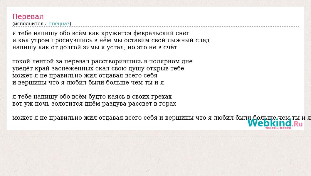 я тебе напишу обо всём как кружится февральский снег и как утром проснувшись в нём мы оставим свой лыжный след напишу как от долгой зимы я устал, но это не в счёт токой лентой за перевал расстворившись в полярном дне уведёт край заснеженных скал свою душу открыв тебе может я не правильно жил отдавая всего себя и вершины что я любил были больше чем ты и я я тебе напишу обо всём будто каясь в своих грехах вот уж ночь золотится днём раздува рассвет в горах может я не правильно жил отдавая всего себя и вершины что я любил были больше чем ты и я