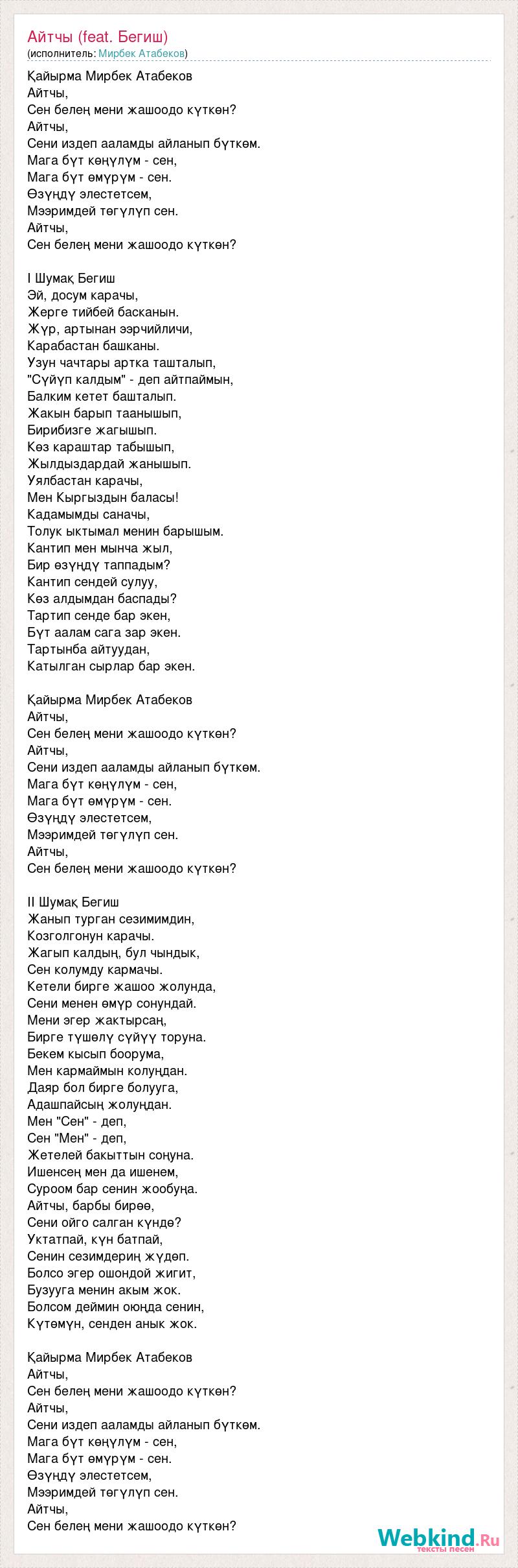 Қайырма Мирбек Атабеков Айтчы, Сен белең мени жашоодо күткөн? Айтчы, Сени издеп ааламды айланып бүткөм. Мага бүт көңүлүм - сен, Мага бүт өмүрүм - сен. Өзүңдү элестетсем, Мээримдей төгүлүп сен. Айтчы, Сен белең мени жашоодо күткөн? I Шумақ Бегиш Эй, досум карачы, Жерге тийбей басканын. Жүр, артынан ээрчийличи, Карабастан башканы. Узун чачтары артка ташталып, "Сүйүп калдым" - деп айтпаймын, Балким кетет башталып. Жакын барып таанышып, Бирибизге жагышып. Көз караштар табышып, Жылдыздардай жанышып. Уялбастан карачы, Мен Кыргыздын баласы! Кадамымды саначы, Толук ыктымал менин барышым. Кантип мен мынча жыл, Бир өзүңдү таппадым? Кантип сендей сулуу, Көз алдымдан баспады? Тартип сенде бар экен, Бүт аалам сага зар экен. Тартынба айтуудан, Катылган сырлар бар экен. Қайырма Мирбек Атабеков Айтчы, Сен белең мени жашоодо күткөн? Айтчы, Сени издеп ааламды айланып бүткөм. Мага бүт көңүлүм - сен, Мага бүт өмүрүм - сен. Өзүңдү элестетсем, Мээримдей төгүлүп сен. Айтчы, Сен белең мени жашоодо күткөн? II Шумақ Бегиш Жанып турган сезимимдин, Козголгонун карачы. Жагып калдың, бул чындык, Сен колумду кармачы. Кетели бирге жашоо жолунда, Сени менен өмүр сонундай. Мени эгер жактырсаң, Бирге түшөлү сүйүү торуна. Бекем кысып боорума, Мен кармаймын колуңдан. Даяр бол бирге болууга, Адашпайсың жолуңдан. Мен "Сен" - деп, Сен "Мен" - деп, Жетелей бакыттын соңуна. Ишенсең мен да ишенем, Суроом бар сенин жообуңа. Айтчы, барбы бирөө, Сени ойго салган күндө? Уктатпай, күн батпай, Сенин сезимдериң жүдөп. Болсо эгер ошондой жигит, Бузууга менин акым жок. Болсом деймин оюңда сенин, Күтөмүн, сенден анык жок. Қайырма Мирбек Атабеков Айтчы, Сен белең мени жашоодо күткөн? Айтчы, Сени издеп ааламды айланып бүткөм. Мага бүт көңүлүм - сен, Мага бүт өмүрүм - сен. Өзүңдү элестетсем, Мээримдей төгүлүп сен. Айтчы, Сен белең мени жашоодо күткөн?