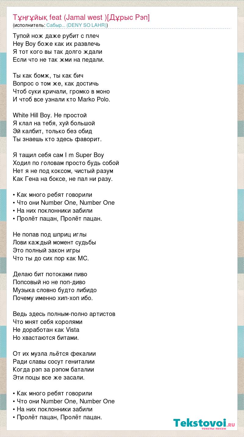 Тупой нож даже рубит с плеч Hey Boy боже как их развлечь Я тот кого вы так долго ждали Если что не так жми на педали. Ты как бомж, ты как бич Вопрос о том же, как достичь Чтоб суки кричали, громко в моно И чтоб все узнали кто Marko Polo. White Hill Boy. Не простой Я клал на тебя, хуй большой Эй калбит, только без обид Ты знаешь кто здесь фаворит. Я тащил себя сам I m Super Boy Ходил по головам просто будь собой Нет я не под коксом, чистый разум Как Гена на боксе, не пал ни разу. • Как много ребят говорили • Что они Number One, Number One • На них поклонники забили • Пролёт пацан, Пролёт пацан. Не попав под шприц иглы Лови каждый момент судьбы Это полный закон игры Что ты до сих пор как МС. Делаю бит потоками пиво Попсовый но не поп-диво Музыка словно будто либидо Почему именно хип-хоп ибо. Ведь здесь полным-полно артистов Что мнят себя королями Не доработан как Vista Но хвастаются битами. От их музла льётся фекалии Ради славы сосут гениталии Когда рэп за рэпом баталии Эти поцы все же засали. • Как много ребят говорили • Что они Number One, Number One • На них поклонники забили • Пролёт пацан, Пролёт пацан.
