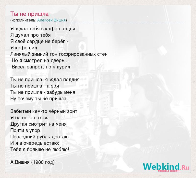 Я ждал тебя в кафе полдня Я думал про тебя Я своё сердце не берёг - Я кофе пил. Линялый зимний тон гофрированных стен Но я смотрел на дверь . Висел запрет, но я курил Ты не пришла, я ждал полдня Ты не пришла - а зря Ты не пришла - забудь меня Ну почему ты не пришла.. Забытый кем-то чёрный зонт Я на него похож Другая смотрит на меня Почти в упор. Последний рубль достаю И я в очередь встаю: Тебя я больше не люблю! А.Вишня (1988 год)